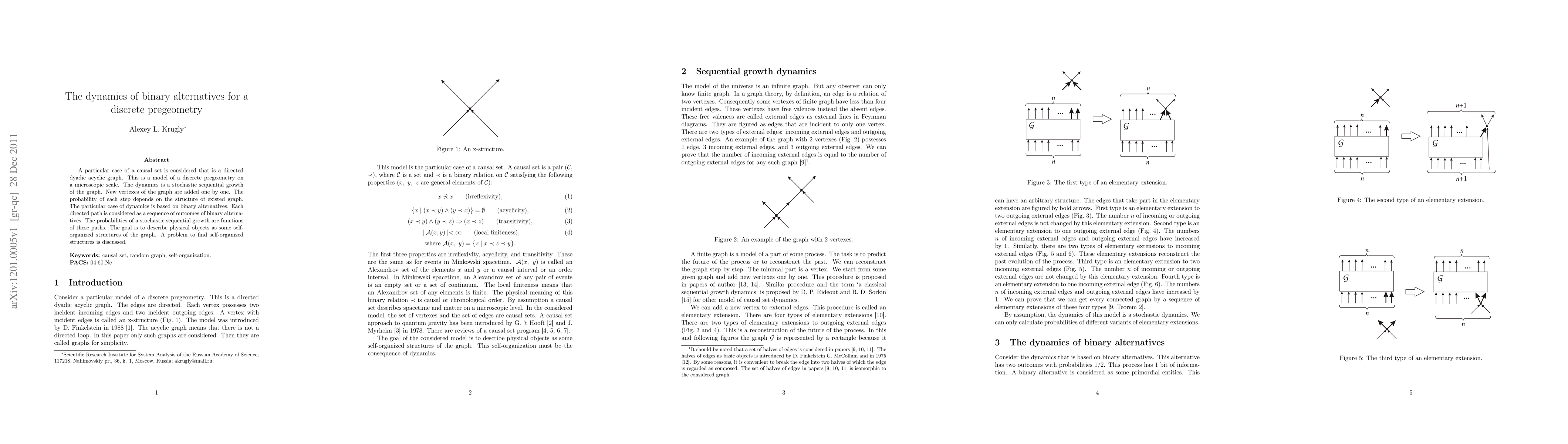 A particular case of a causal set is considered that is a directed dyadic acyclic graph. This is a model of a discrete pregeometry on a microscopic scale. The dynamics is a stochastic sequential growth of the graph. New vertexes of the graph are added one by one. The probability of each step depends on the structure of existed graph. The particular case of dynamics is based on binary alternatives. Each directed path is considered as a sequence of outcomes of binary alternatives. The probabilities of a stochastic sequential growth are functions of these paths. The goal is to describe physical objects as some self-organized structures of the graph. A problem to find self-organized structures is discussed.