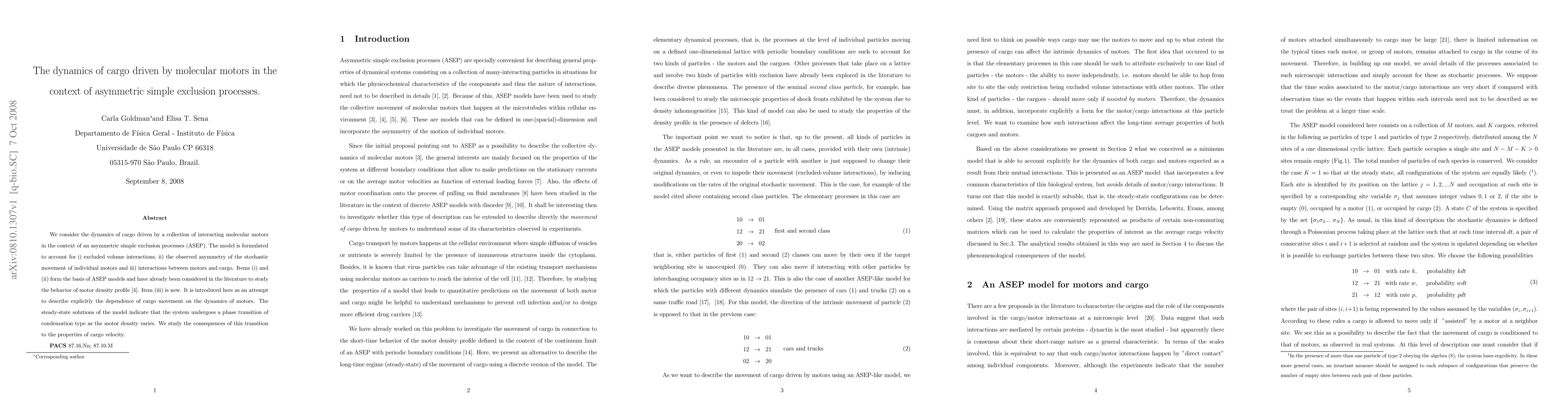 We consider the dynamics of cargo driven by a collection of interacting molecular motors in the context of an asymmetric simple exclusion processes (ASEP). The model is formulated to account for i) excluded volume interactions, ii) the observed asymmetry of the stochastic movement of individual motors and iii) interactions between motors and cargo. Items (i) and (ii) form the basis of ASEP models and have already been considered in the literature to study the behavior of motor density profile [Parmeggiani 03]. Item (iii) is new. It is introduced here as an attempt to describe explicitly the dependence of cargo movement on the dynamics of motors. The steady-state solutions of the model indicate that the system undergoes a phase transition of condensation type as the motor density varies. We study the consequences of this transition to the properties of cargo velocity.
