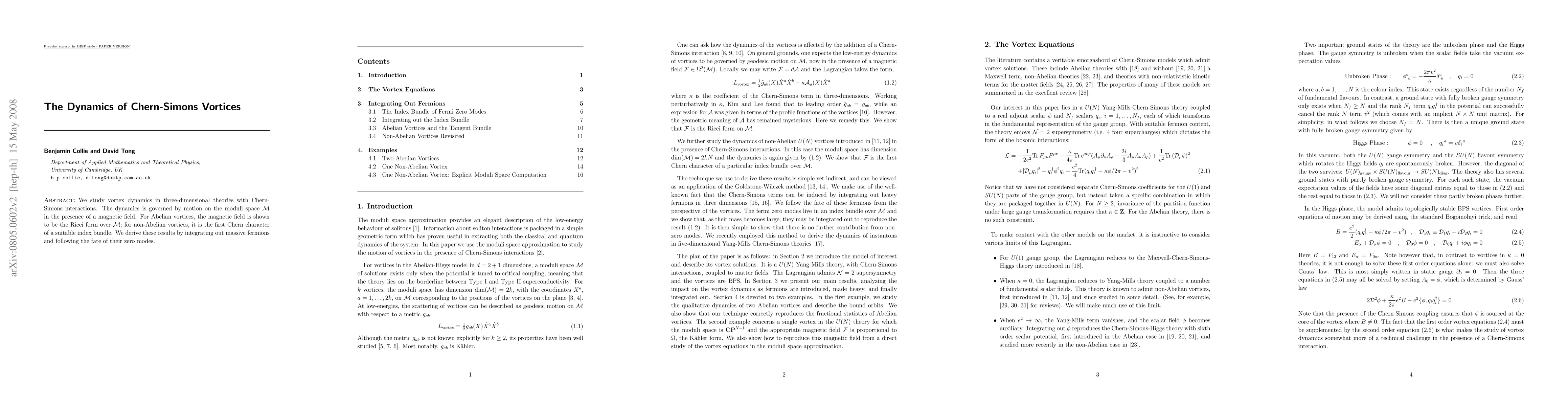 This paper explores the dynamics of vortices in three-dimensional Chern-Simons theories, revealing that Abelian vortices are influenced by the Ricci form over the moduli space, while non-Abelian vortices are affected by the first Chern character of an index bundle, derived through the integration of massive fermions and their zero modes.