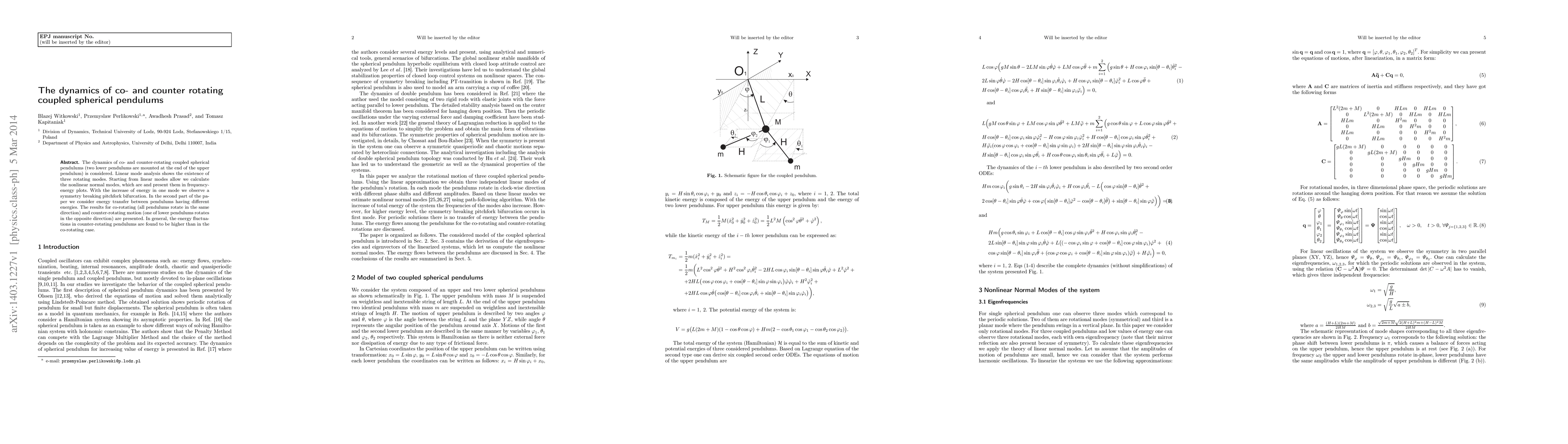 This paper investigates the dynamics of coupled spherical pendulums, identifying three rotating modes via linear analysis. It explores nonlinear normal modes and observes symmetry breaking bifurcations with increased energy, followed by a study of energy transfer between pendulums, revealing higher energy fluctuations in counter-rotating configurations compared to co-rotating ones.
