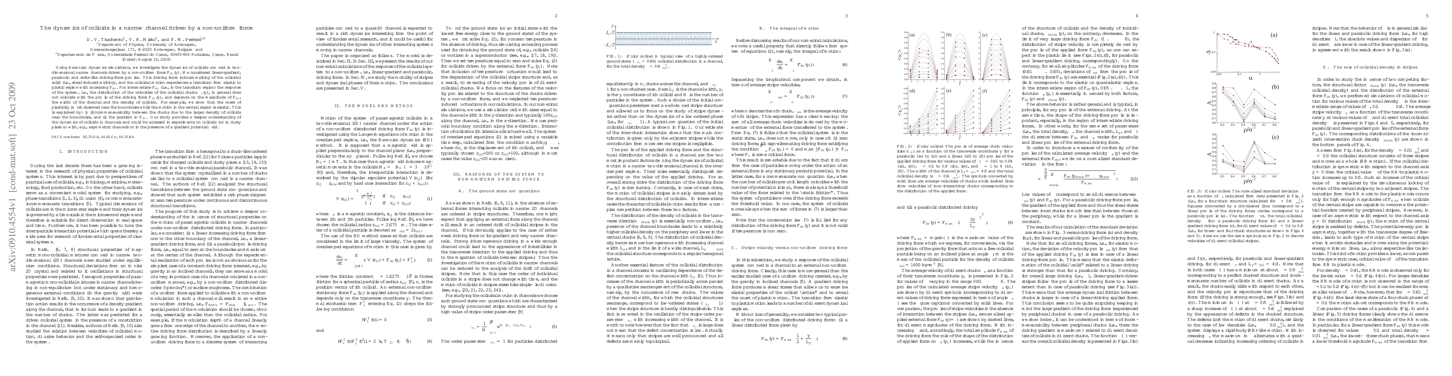 This study uses Brownian dynamics simulations to explore the behavior of colloids in narrow channels under non-uniform forces, revealing a transition from elastic to plastic regimes and a complex velocity distribution influenced by the force profile, channel width, and colloid density. The onset of plasticity near channel boundaries is attributed to higher colloid density and force gradients.