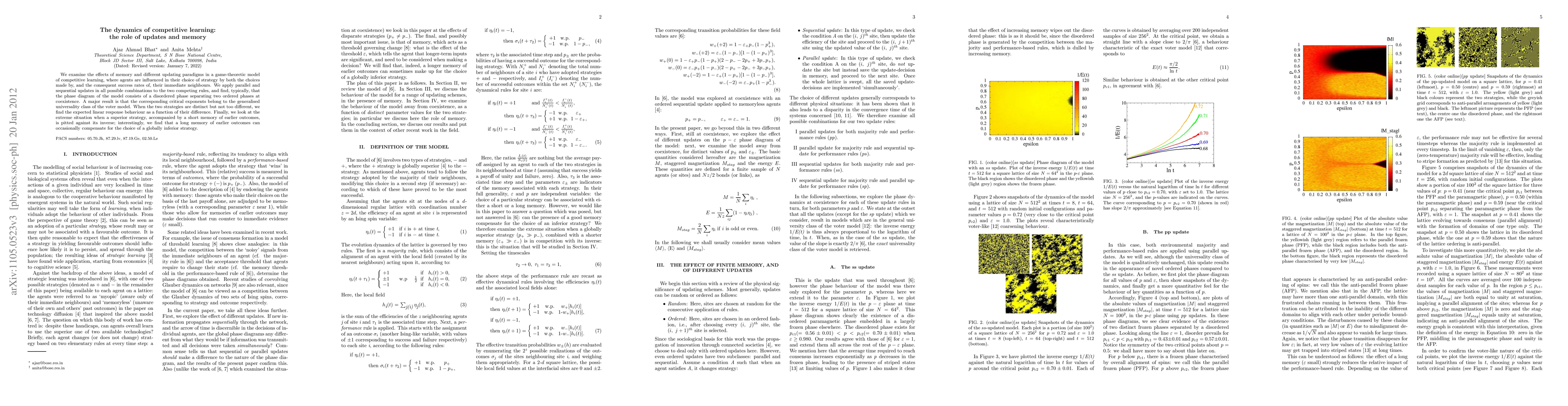 We examine the effects of memory and different updating paradigms in a game-theoretic model of competitive learning, where agents are influenced in their choice of strategy by both the choices made by, and the consequent success rates of, their immediate neighbours. We apply parallel and sequential updates in all possible combinations to the two competing rules, and find, typically, that the phase diagram of the model consists of a disordered phase separating two ordered phases at coexistence. A major result is that the corresponding critical exponents belong to the generalised universality class of the voter model. When the two strategies are distinct but not too different, we find the expected linear response behaviour as a function of their difference.Finally, we look at the extreme situation when a superior strategy, accompanied by a short memory of earlier outcomes, is pitted against its inverse; interestingly, we find that a long memory of earlier outcomes can occasionally compensate for the choice of a globally inferior strategy.