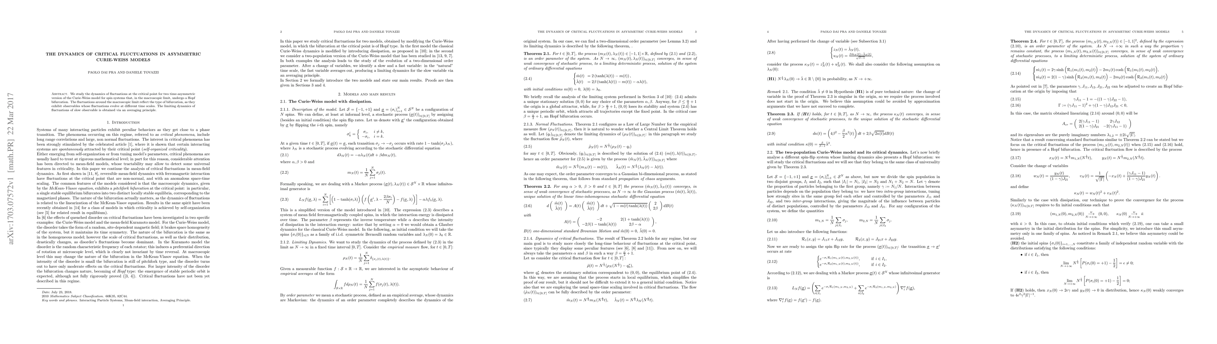 This paper investigates the critical fluctuations in asymmetric Curie-Weiss models undergoing a Hopf bifurcation, revealing that fluctuations evolve at different time scales and the dynamics of slow observables are derived through an averaging principle.