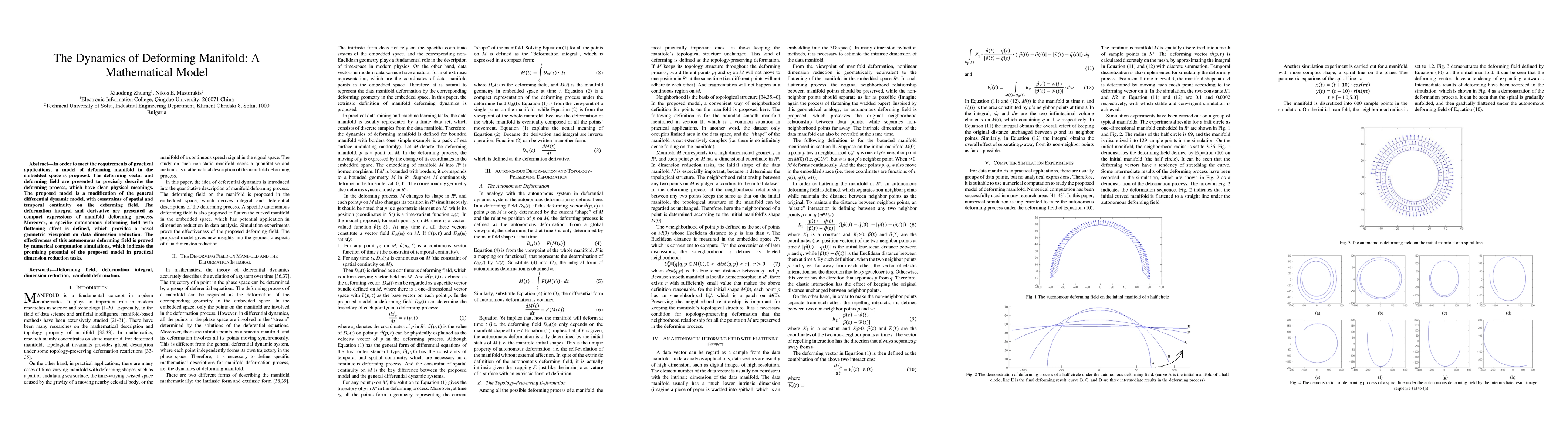 In order to meet the requirements of practical applications, a model of deforming manifold in the embedded space is proposed. The deforming vector and deforming field are presented to precisely describe the deforming process, which have clear physical meanings. The proposed model is a modification of the general differential dynamic model, with constraints of spatial and temporal continuity on the deforming field. The deformation integral and derivative are presented as compact expressions of manifold deforming process. Moreover, a specific autonomous deforming field with flattening effect is defined, which provides a novel geometric viewpoint on data dimension reduction. The effectiveness of this autonomous deforming field is proved by numerical computation simulations, which indicate the promising potential of the proposed model in practical dimension reduction tasks.