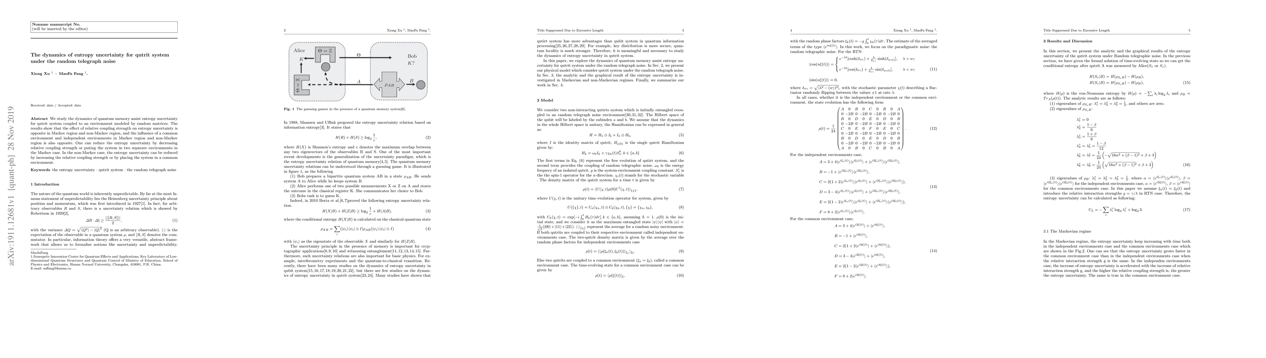 We study the dynamics of quantum memory assist entropy uncertainty for qutrit system coupled to an environment modeled by random matrices. The results show that the effect of relative coupling strength on entropy uncertainty is opposite in Markov region and non-Markov region, and the influence of a common environment and independent environments in Markov region and non-Markov region is also opposite. One can reduce the entropy uncertainty by decreasing relative coupling strength or puting the system in two separate environments in the Markov case. In the non-Markov case, the entropy uncertainty can be reduced by increasing the relative coupling strength or by placing the system in a common environment.