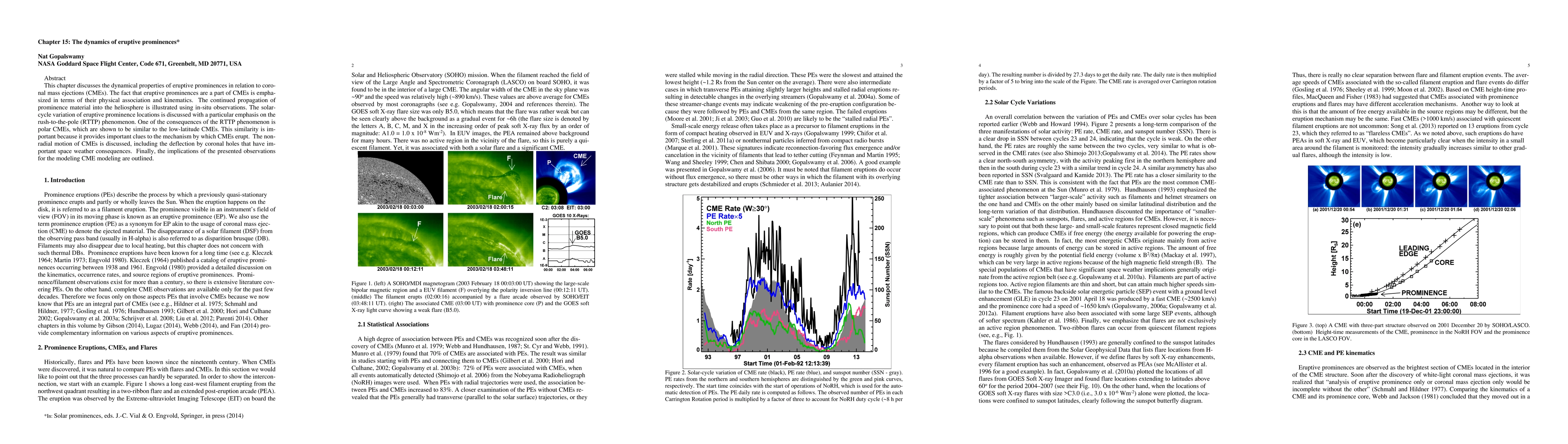 This paper explores the dynamics of eruptive prominences, highlighting their role in coronal mass ejections (CMEs) and their physical association and kinematics. It discusses the solar-cycle variation and the "rush-to-the-pole" phenomenon, emphasizing the implications for CME mechanisms and their nonradial motion, including deflection by coronal holes.
