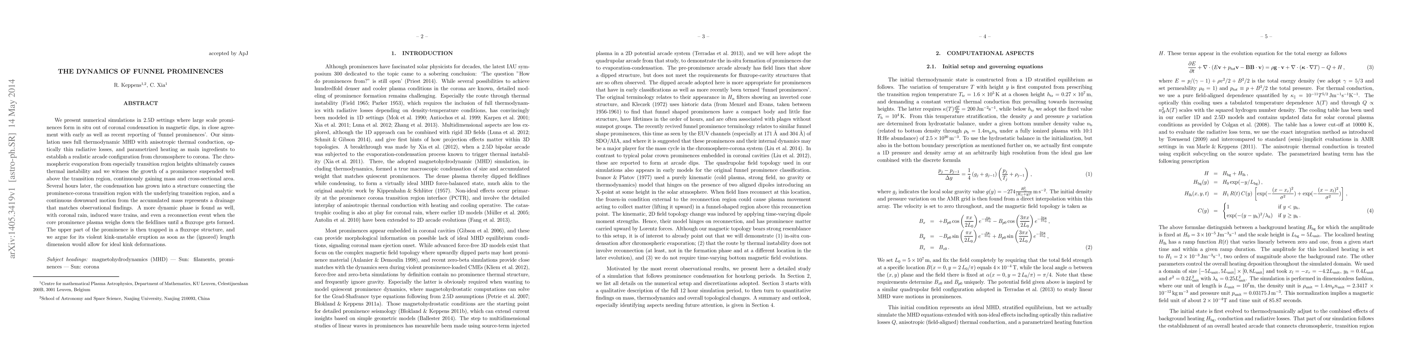 This paper presents 2.5D numerical simulations showing the formation and dynamics of funnel prominences in the solar corona, driven by thermal instability and magnetic field interactions. The simulations reveal prominence growth, drainage, coronal rain, wave trains, and eventual eruption due to fluxrope formation.