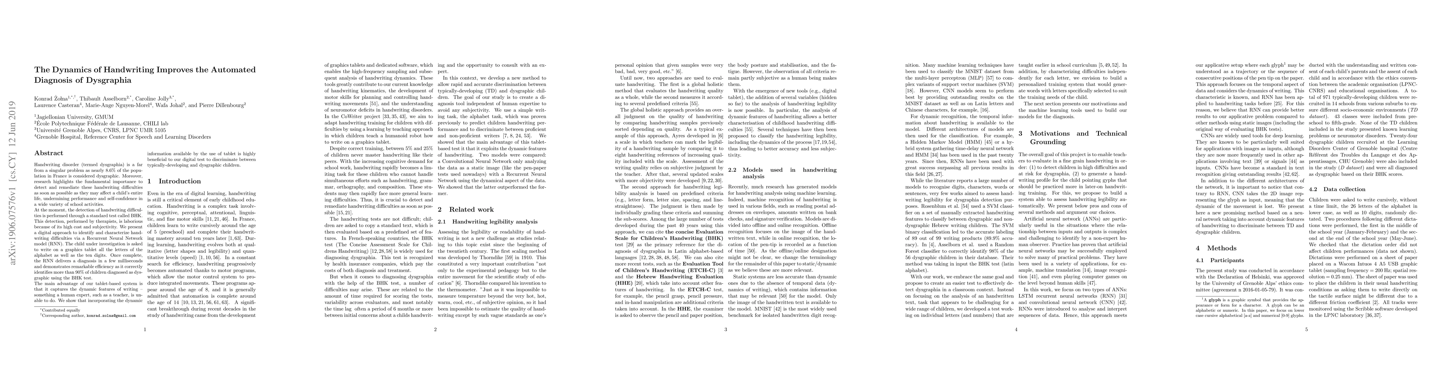 Handwriting disorder (termed dysgraphia) is a far from a singular problem as nearly 8.6% of the population in France is considered dysgraphic. Moreover, research highlights the fundamental importance to detect and remediate these handwriting difficulties as soon as possible as they may affect a child's entire life, undermining performance and self-confidence in a wide variety of school activities. At the moment, the detection of handwriting difficulties is performed through a standard test called BHK. This detection, performed by therapists, is laborious because of its high cost and subjectivity. We present a digital approach to identify and characterize handwriting difficulties via a Recurrent Neural Network model (RNN). The child under investigation is asked to write on a graphics tablet all the letters of the alphabet as well as the ten digits. Once complete, the RNN delivers a diagnosis in a few milliseconds and demonstrates remarkable efficiency as it correctly identifies more than 90% of children diagnosed as dysgraphic using the BHK test. The main advantage of our tablet-based system is that it captures the dynamic features of writing -- something a human expert, such as a teacher, is unable to do. We show that incorporating the dynamic information available by the use of tablet is highly beneficial to our digital test to discriminate between typically-developing and dysgraphic children.