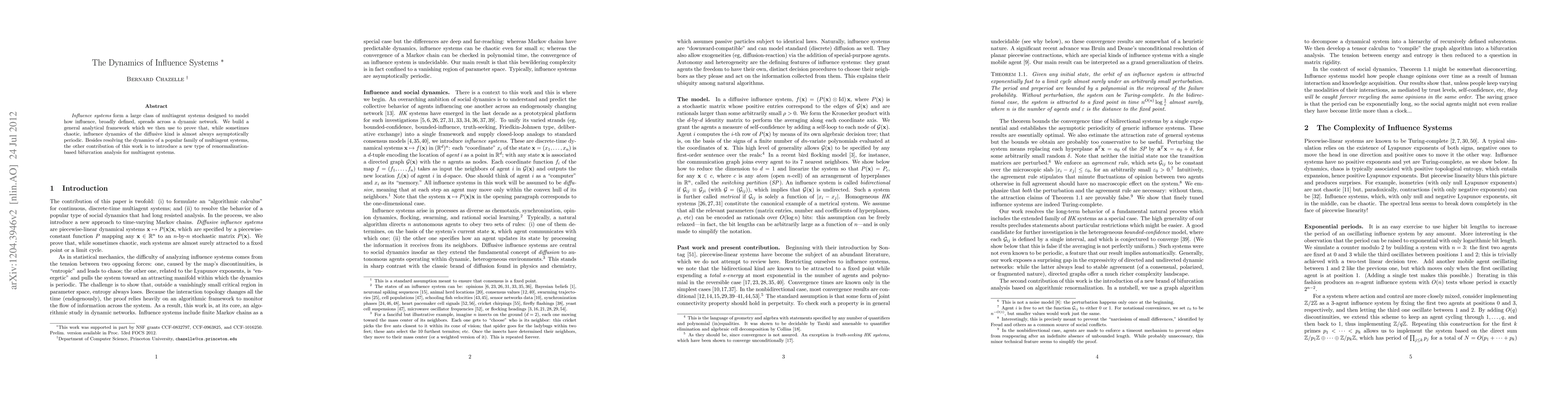 This paper develops an analytical framework to study the dynamics of influence systems, proving that diffusive influence spreads are typically asymptotically periodic despite chaotic fluctuations. It also introduces a novel renormalization-based bifurcation analysis technique for multiagent systems.