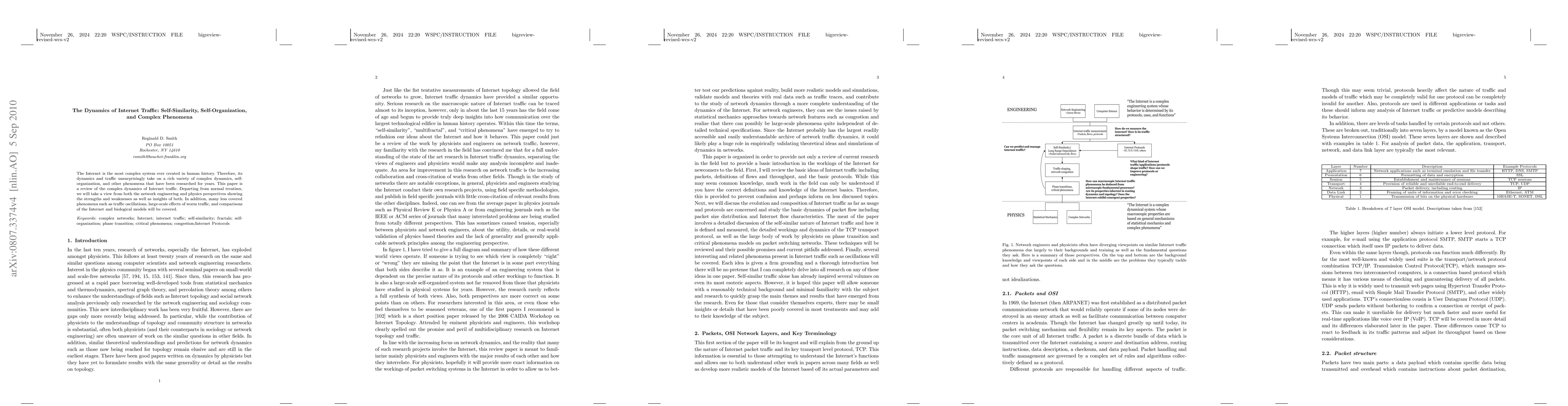 This paper reviews the complex dynamics of Internet traffic, examining self-similarity, self-organization, and complex phenomena from both network engineering and physics perspectives, while also exploring less covered topics like traffic oscillations and large-scale worm traffic effects.