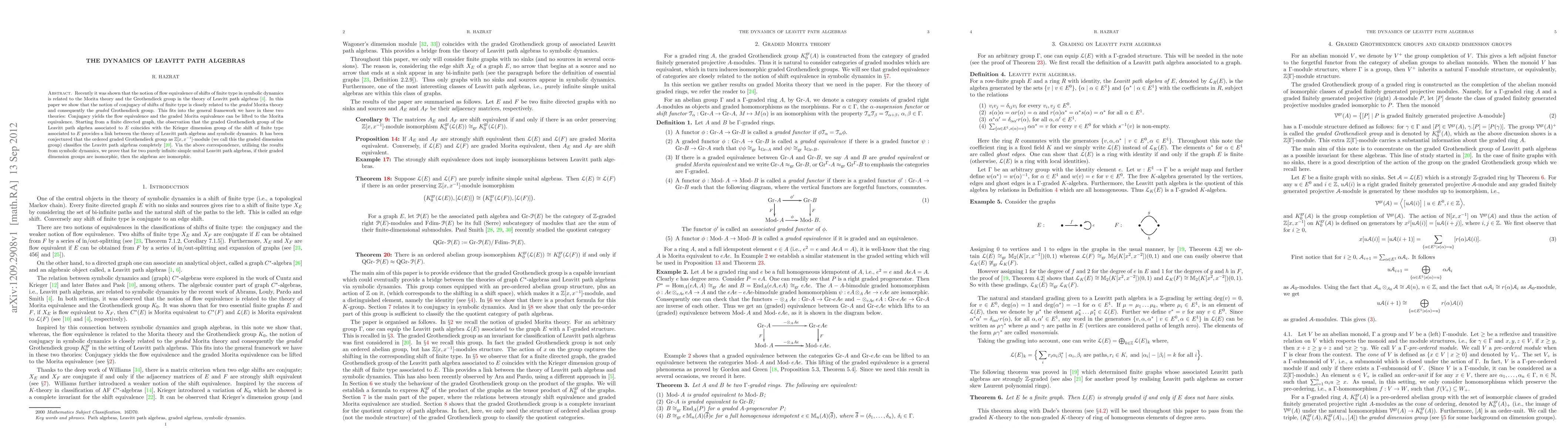 Recently it was shown that the notion of flow equivalence of shifts of finite type in symbolic dynamics is related to the Morita theory and the Grothendieck group in the theory of Leavitt path algebras \cite{flowa}. In this paper we show that the notion of conjugacy of shifts of finite type is closely related to the {\it graded} Morita theory and consequently the {\it graded} Grothendieck group. This fits into the general framework we have in these two theories: Conjugacy yields the flow equivalence and the graded Morita equivalence can be lifted to the Morita equivalence. Starting from a finite directed graph, the observation that the graded Grothendieck group of the Leavitt path algebra associated to $E$ coincides with the Krieger dimension group of the shift of finite type associated to $E$ provides a link between the theory of Leavitt path algebras and symbolic dynamics. It has been conjectured that the ordered graded Grothendieck group as $\mathbb Z[x,x^{-1}]$-module (we call this the graded dimension group) classifies the Leavitt path algebras completely \cite{hazann}. Via the above correspondence, utilising the results from symbolic dynamics, we prove that for two purely infinite simple unital Leavitt path algebras, if their graded dimension groups are isomorphic, then the algebras are isomorphic.