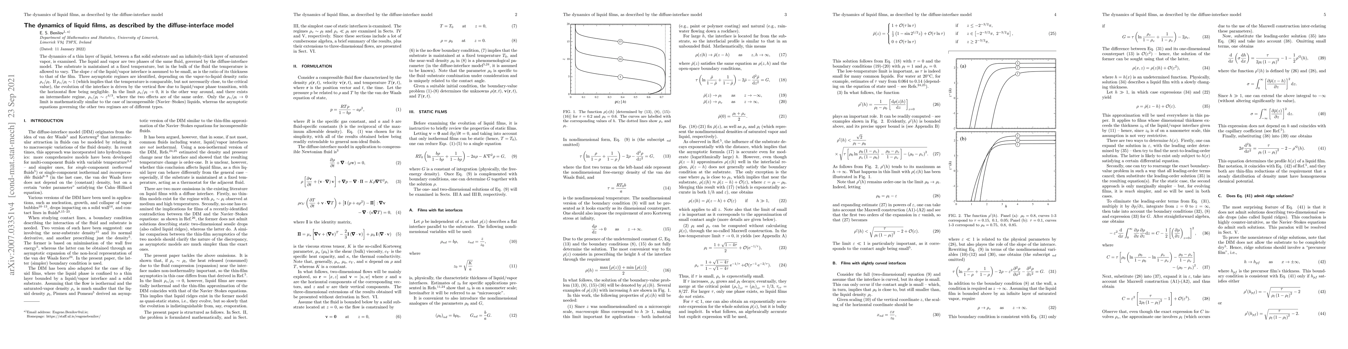 Researchers studied the dynamics of a thin liquid film between a solid substrate and saturated vapor, identifying three asymptotic regimes based on the density ratio of vapor to liquid, one of which is similar to incompressible liquids.