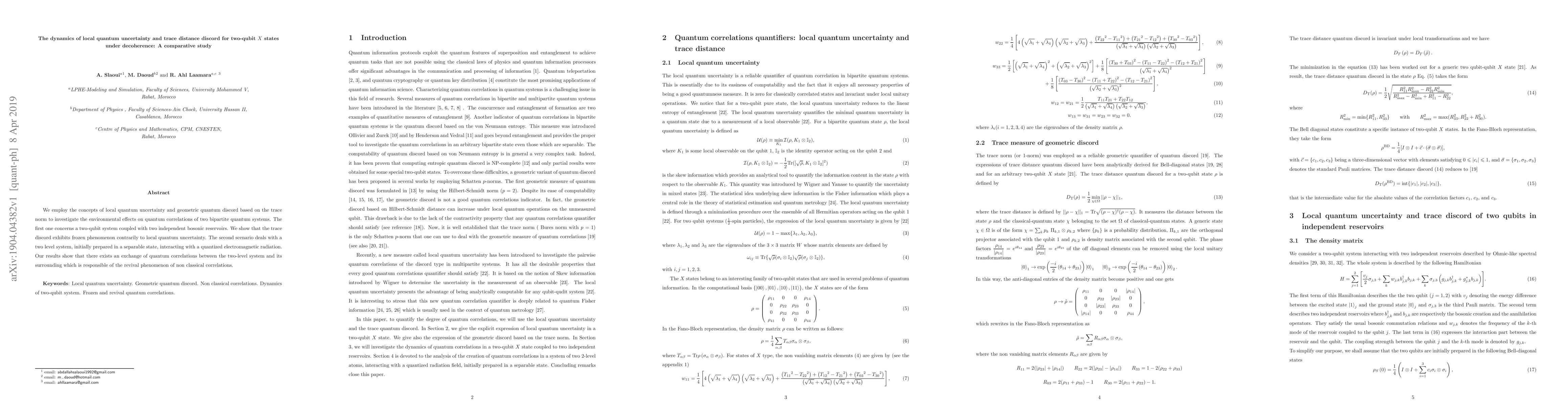 This paper examines the effects of decoherence on quantum correlations in two-qubit systems, finding that trace discord shows a "frozen" behavior while local quantum uncertainty changes. It also investigates a two-level system interacting with electromagnetic radiation, revealing an exchange of quantum correlations leading to the revival of non-classical correlations.