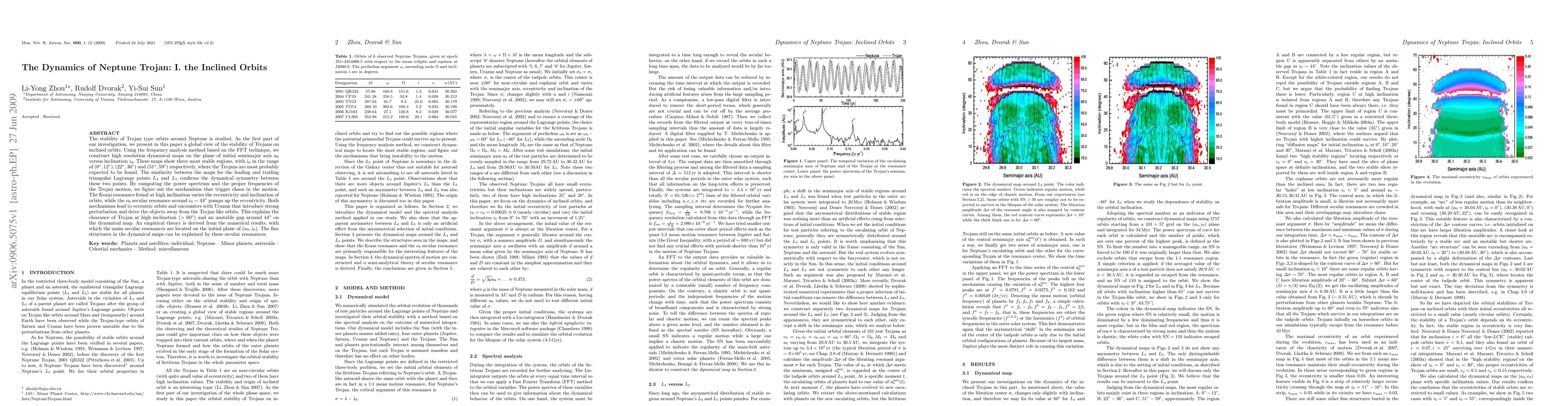The stability of Trojan type orbits around Neptune is studied. As the first part of our investigation, we present in this paper a global view of the stability of Trojans on inclined orbits. Using the frequency analysis method based on the FFT technique, we construct high resolution dynamical maps on the plane of initial semimajor axis $a_0$ versus inclination $i_0$. These maps show three most stable regions, with $i_0$ in the range of $(0^\circ,12^\circ), (22^\circ,36^\circ)$ and $(51^\circ,59^\circ)$ respectively, where the Trojans are most probably expected to be found. The similarity between the maps for the leading and trailing triangular Lagrange points $L_4$ and $L_5$ confirms the dynamical symmetry between these two points. By computing the power spectrum and the proper frequencies of the Trojan motion, we figure out the mechanisms that trigger chaos in the motion. The Kozai resonance found at high inclination varies the eccentricity and inclination of orbits, while the $\nu_8$ secular resonance around $i_0\sim44^\circ$ pumps up the eccentricity. Both mechanisms lead to eccentric orbits and encounters with Uranus that introduce strong perturbation and drive the objects away from the Trojan like orbits. This explains the clearance of Trojan at high inclination ($>60^\circ$) and an unstable gap around $44^\circ$ on the dynamical map. An empirical theory is derived from the numerical results, with which the main secular resonances are located on the initial plane of $(a_0,i_0)$. The fine structures in the dynamical maps can be explained by these secular resonances.
