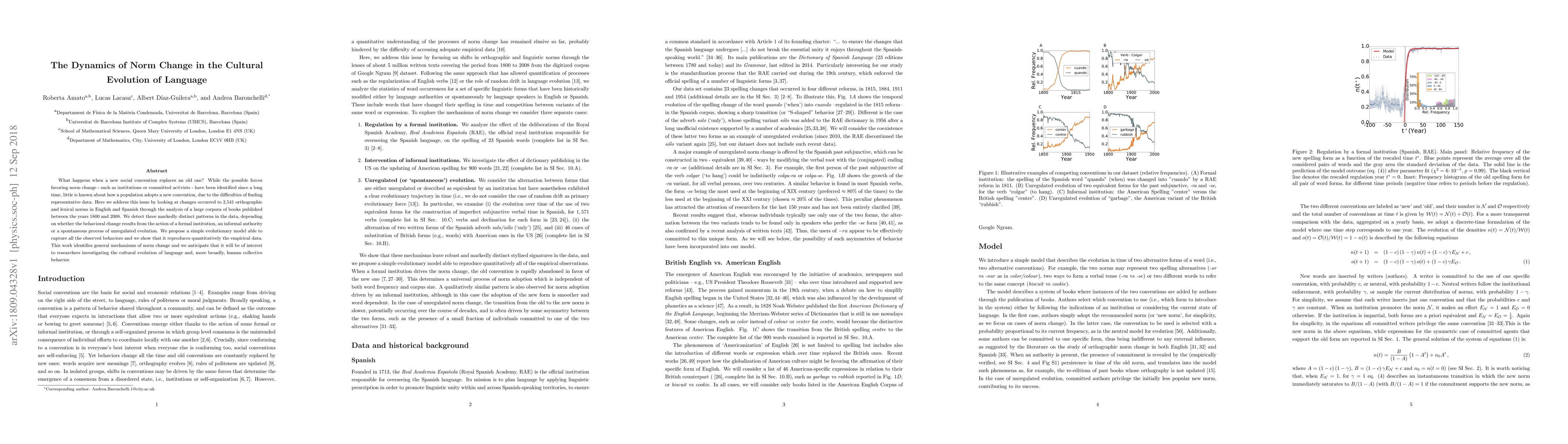 What happens when a new social convention replaces an old one? While the possible forces favoring norm change - such as institutions or committed activists - have been identified since a long time, little is known about how a population adopts a new convention, due to the difficulties of finding representative data. Here we address this issue by looking at changes occurred to 2,541 orthographic and lexical norms in English and Spanish through the analysis of a large corpora of books published between the years 1800 and 2008. We detect three markedly distinct patterns in the data, depending on whether the behavioral change results from the action of a formal institution, an informal authority or a spontaneous process of unregulated evolution. We propose a simple evolutionary model able to capture all the observed behaviors and we show that it reproduces quantitatively the empirical data. This work identifies general mechanisms of norm change and we anticipate that it will be of interest to researchers investigating the cultural evolution of language and, more broadly, human collective behavior.