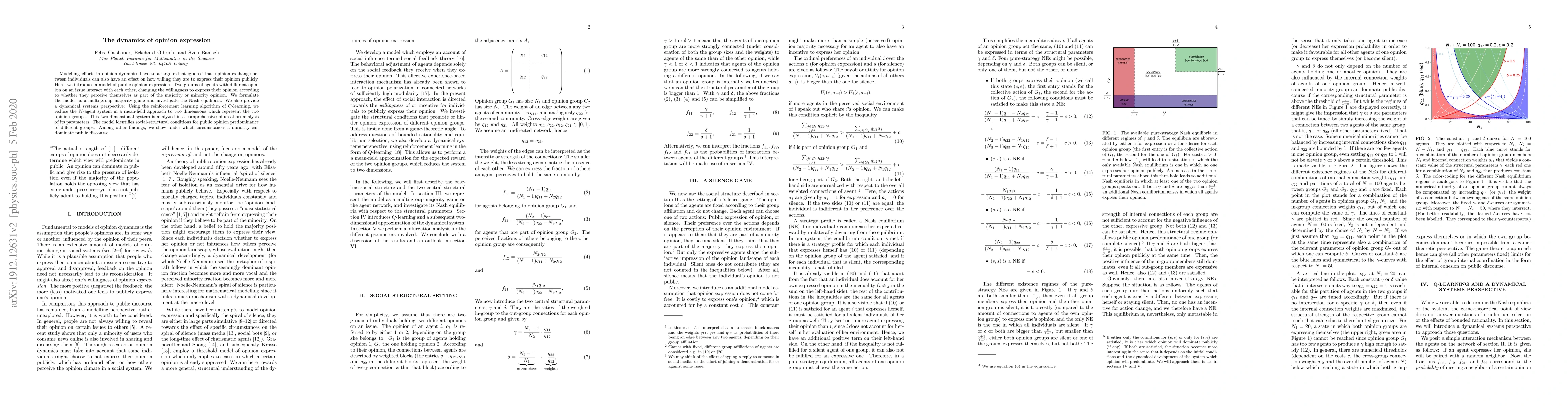 The research employs a multi-group majority game model of public opinion expression, using a dynamical systems perspective with Q-learning to reduce the N-agent system to a two-dimensional representation. The model investigates Nash equilibria and conducts a comprehensive bifurcation analysis of its parameters.