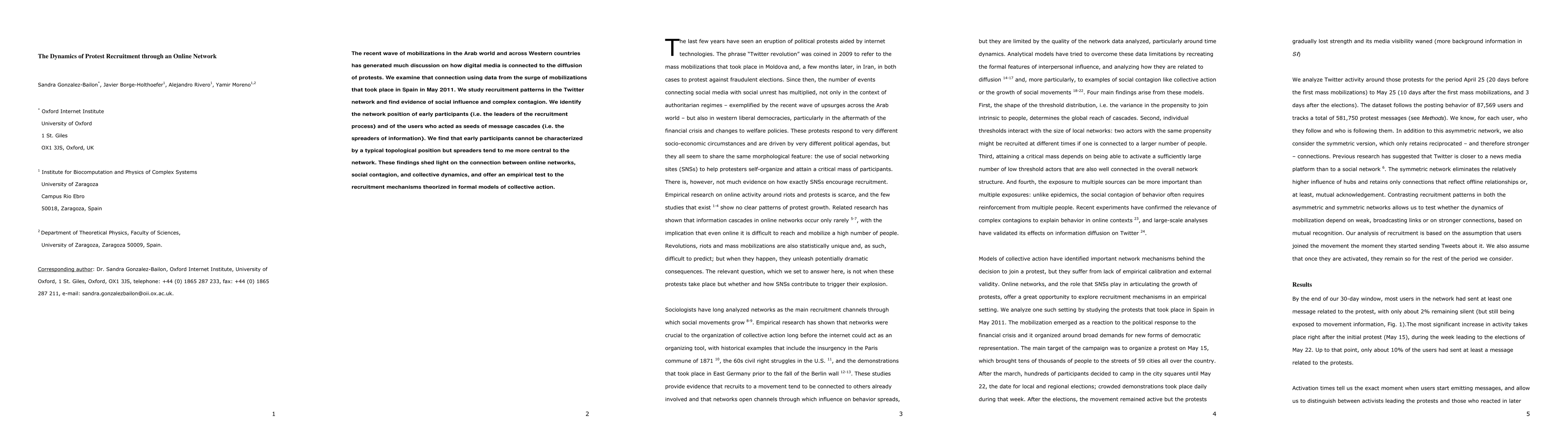 This paper investigates the dynamics of protest recruitment via Twitter during the 2011 Spanish mobilizations, revealing evidence of social influence and complex contagion. It highlights that while early participants lack a typical network position, information spreaders tend to occupy more central roles in the network.