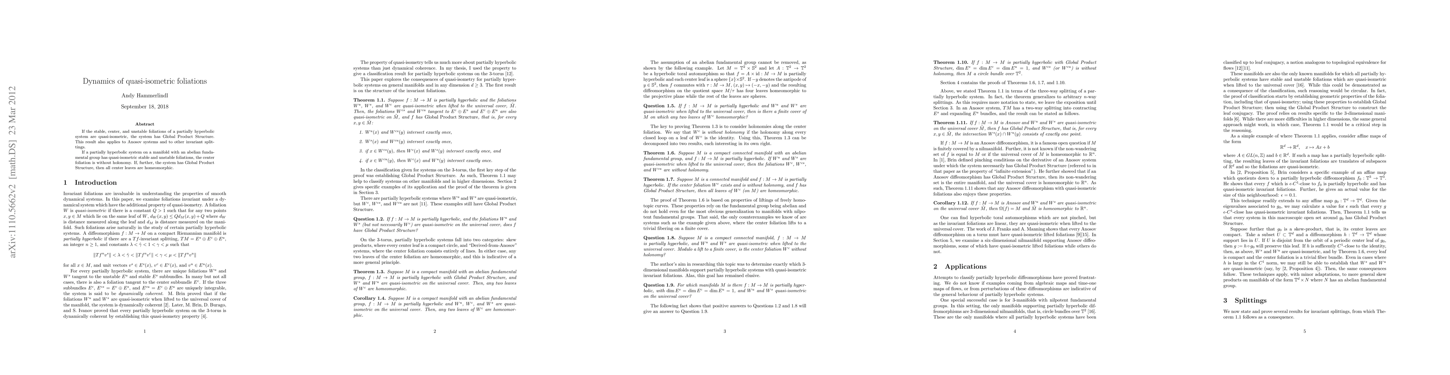 If the stable, center, and unstable foliations of a partially hyperbolic system are quasi-isometric, the system has Global Product Structure. This result also applies to Anosov systems and to other invariant splittings. If a partially hyperbolic system on a manifold with abelian fundamental group has quasi-isometric stable and unstable foliations, the center foliation is without holonomy. If, further, the system has Global Product Structure, then all center leaves are homeomorphic.