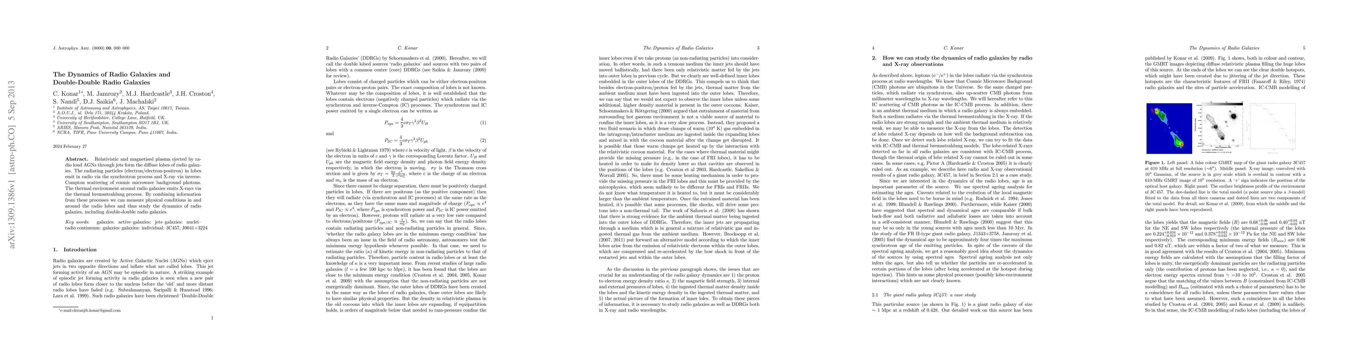 Relativistic and magnetised plasma ejected by radio loud AGNs through jets form the diffuse lobes of radio galaxies. The radiating particles (electron/electron-positron) in lobes emit in radio via the synchrotron process and X-ray via inverse-Compton scattering of cosmic microwave background photons. The thermal environment around radio galaxies emits X-rays via the thermal bremsstrahlung process. By combining information from these processes we can measure physical conditions in and around the radio lobes and thus study the dynamics of radio galaxies, including double-double radio galaxies.