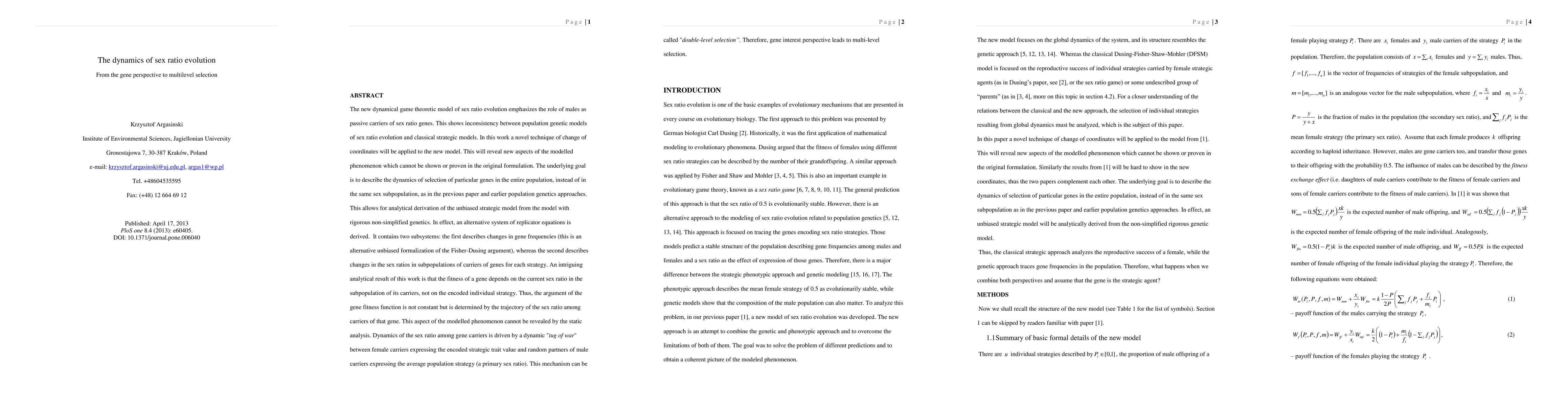 The new dynamical game theoretic model of sex ratio evolution emphasizes the role of males as passive carriers of sex ratio genes. This shows inconsistency between population genetic models of sex ratio evolution and classical strategic models. In this work a novel technique of change of coordinates will be applied to the new model. This will reveal new aspects of the modelled phenomenon which cannot be shown or proven in the original formulation. The underlying goal is to describe the dynamics of selection of particular genes in the entire population, instead of in the same sex subpopulation, as in the previous paper and earlier population genetics approaches. This allows for analytical derivation of the unbiased strategic model from the model with rigorous non-simplified genetics. In effect, an alternative system of replicator equations is derived. It contains two subsystems: the first describes changes in gene frequencies (this is an alternative unbiased formalization of the Fisher-Dusing argument), whereas the second describes changes in the sex ratios in subpopulations of carriers of genes for each strategy. An intriguing analytical result of this work is that fitness of a gene depends on the current sex ratio in the subpopulation of its carriers, not on the encoded individual strategy. Thus, the argument of the gene fitness function is not constant but is determined by the trajectory of the sex ratio among carriers of that gene. This aspect of the modelled phenomenon cannot be revealed by the static analysis. Dynamics of the sex ratio among gene carriers is driven by a dynamic "tug of war" between female carriers expressing the encoded strategic trait value and random partners of male carriers expressing the average population strategy (a primary sex ratio). This mechanism can be called "double level selection". Therefore, gene interest perspective leads to multi-level selection.