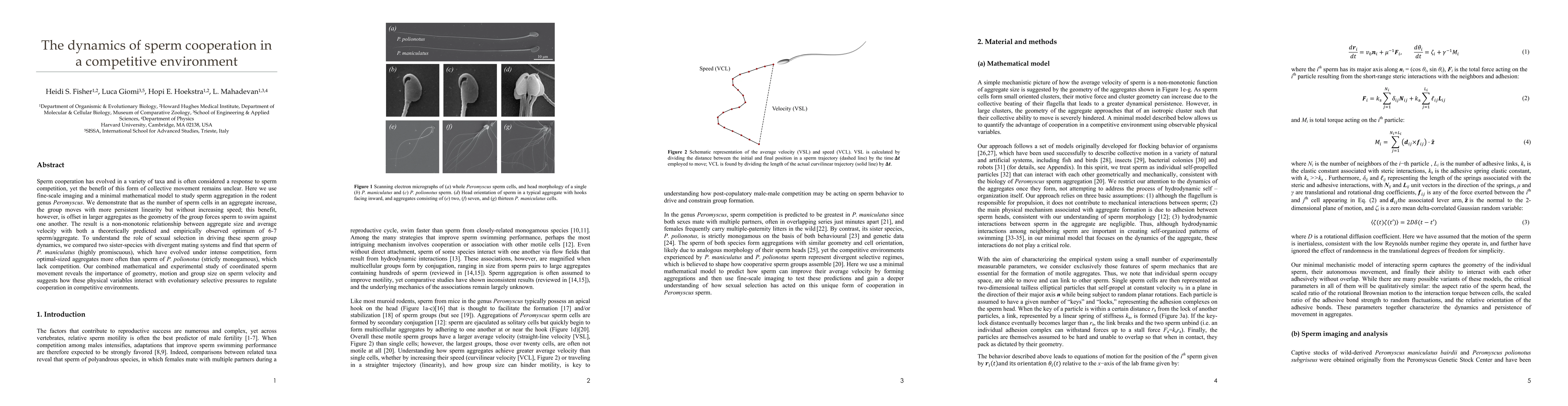 This study investigates how sperm cooperation in the rodent genus Peromyscus affects movement dynamics under competitive conditions. The research finds that while larger sperm aggregates move more linearly, they also experience increased friction, leading to an optimal aggregate size of 6-7 sperm for maximum velocity. Species under intense competition form these optimal-sized groups more frequently than those in monogamous systems.