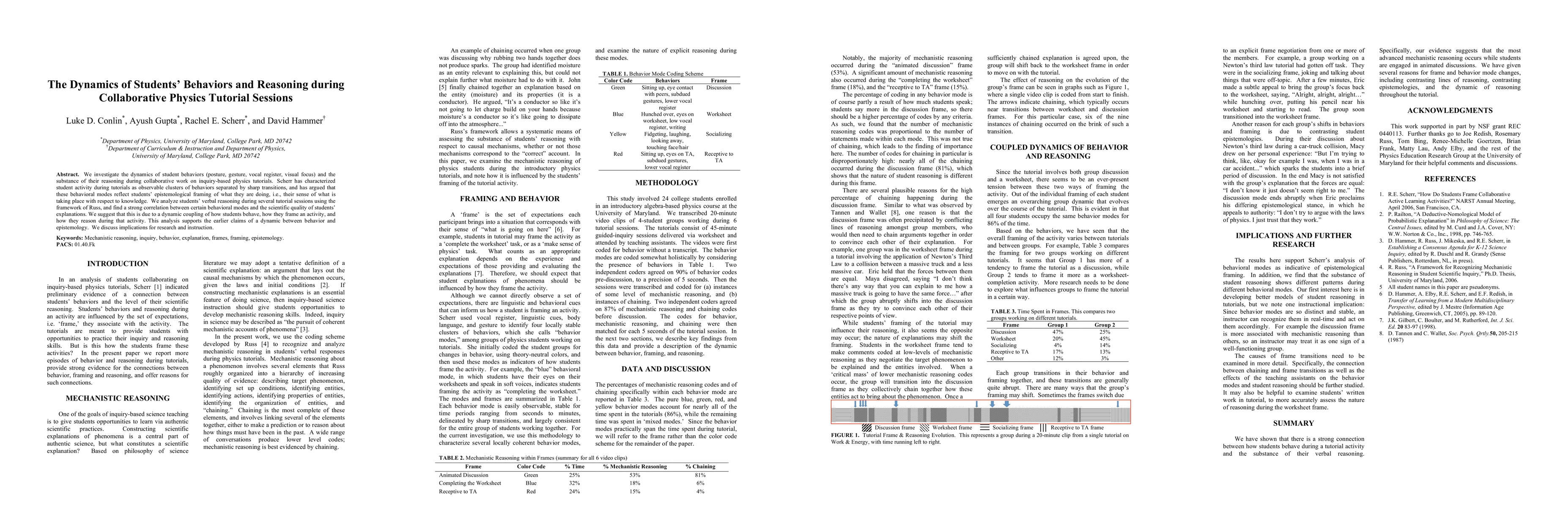 This paper examines how students' observable behaviors and reasoning correlate during collaborative physics tutorials, finding that specific behavioral modes are linked to the quality of scientific explanations. The study supports the notion that students' behavior, framing of activities, and reasoning are dynamically coupled.