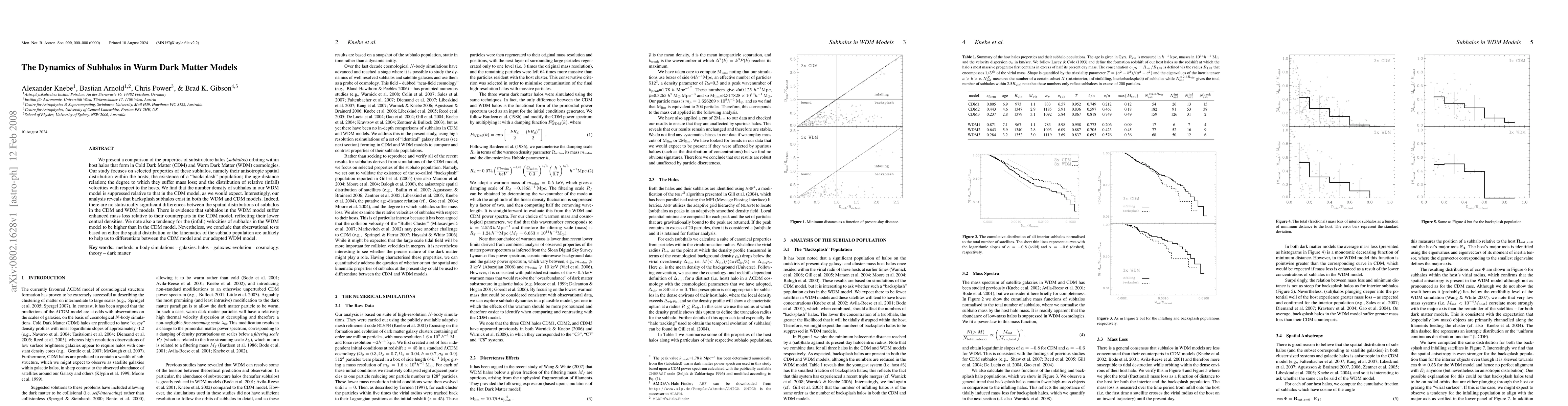 This study compares subhalo properties in Cold Dark Matter (CDM) and Warm Dark Matter (WDM) models, finding that while subhalo number density is lower in WDM, their spatial distributions and backsplash populations are similar. Enhanced mass loss and higher infall velocities in WDM subhalos suggest differences, but these do not provide clear observational distinctions between CDM and WDM models.