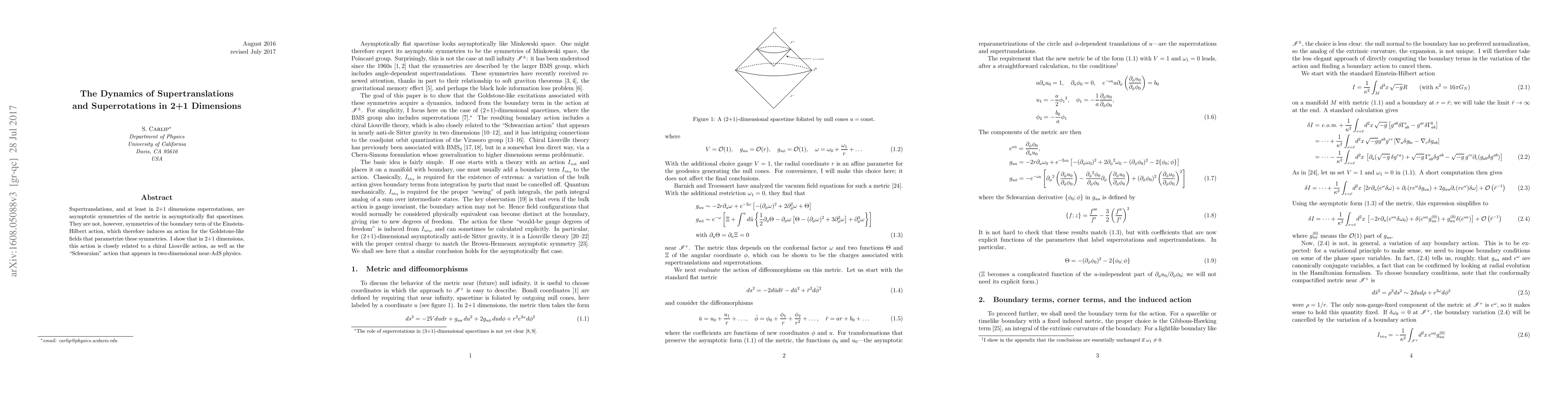 Supertranslations, and at least in 2+1 dimensions superrotations, are asymptotic symmetries of the metric in asymptotically flat spacetimes. They are not, however, symmetries of the boundary term of the Einstein-Hilbert action, which therefore induces an action for the Goldstone-like fields that parametrize these symmetries. I show that in 2+1 dimensions, this action is closely related to a chiral Liouville action, as well as the "Schwarzian" action that appears in two-dimensional near-AdS physics.