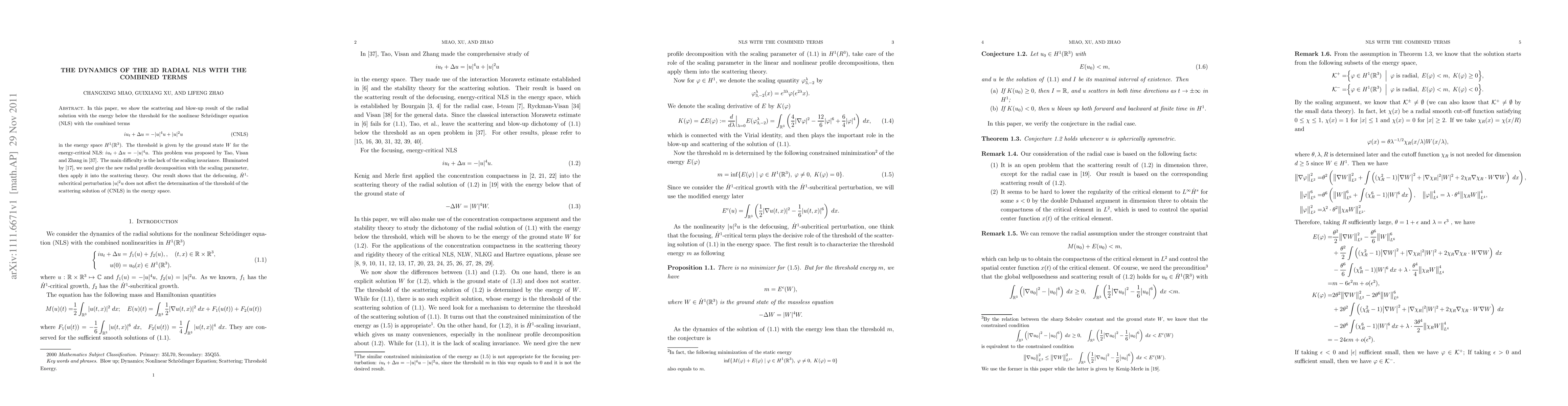 This paper investigates the scattering and blow-up behavior of radial solutions for the 3D radial nonlinear Schrödinger equation (NLS) with combined terms, demonstrating that the defocusing perturbation does not alter the scattering threshold. The study introduces a new radial profile decomposition to address the lack of scaling invariance.