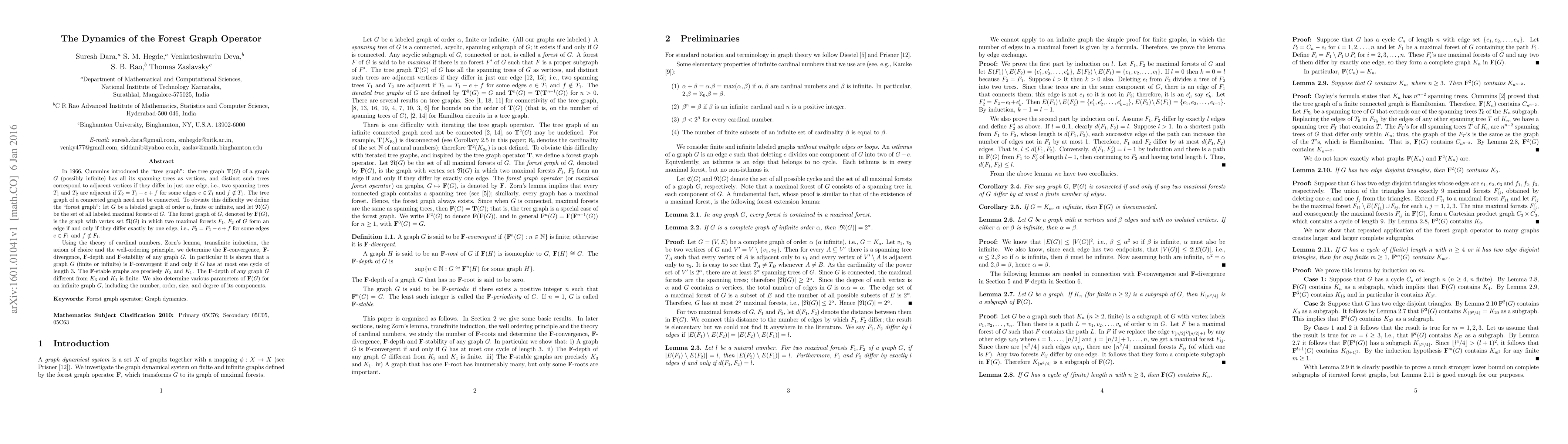 In 1966, Cummins introduced the "tree graph": the tree graph $\mathbf{T}(G)$ of a graph $G$ (possibly infinite) has all its spanning trees as vertices, and distinct such trees correspond to adjacent vertices if they differ in just one edge, i.e., two spanning trees $T_1$ and $T_2$ are adjacent if $T_2 = T_1 -e +f$ for some edges $e\in T_1$ and $f\notin T_1$. The tree graph of a connected graph need not be connected. To obviate this difficulty we define the "forest graph": let $G$ be a labeled graph of order $\alpha$, finite or infinite, and let $\mathfrak{N}(G)$ be the set of all labeled maximal forests of $G$. The forest graph of $G$, denoted by $\mathbf{F}(G)$, is the graph with vertex set $\mathfrak{N}(G)$ in which two maximal forests $F_1$, $F_2$ of $G$ form an edge if and only if they differ exactly by one edge, i.e., $F_2 = F_1 -e +f$ for some edges $e\in F_1$ and $f\notin F_1$. Using the theory of cardinal numbers, Zorn's lemma, transfinite induction, the axiom of choice and the well-ordering principle, we determine the $\mathbf{F}$-convergence, $\mathbf{F}$-divergence, $\mathbf{F}$-depth and $\mathbf{F}$-stability of any graph $G$. In particular it is shown that a graph $G$ (finite or infinite) is $\mathbf{F}$-convergent if and only if $G$ has at most one cycle of length 3. The $\mathbf{F}$-stable graphs are precisely $K_3$ and $K_1$. The $\mathbf{F}$-depth of any graph $G$ different from $K_3$ and $K_1$ is finite. We also determine various parameters of $\mathbf{F}(G)$ for an infinite graph $G$, including the number, order, size, and degree of its components.