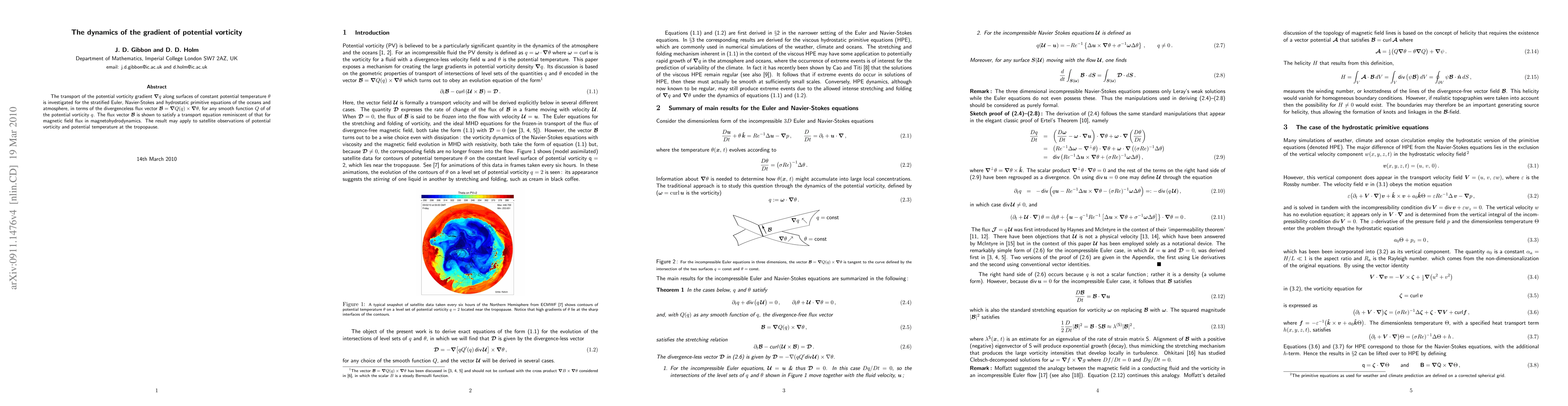 This research explores the transport of potential vorticity gradient (q) along constant temperature surfaces in ocean and atmospheric models. Using a divergenceless flux vector B, it's shown that B doesn't remain 'frozen' into the flow when divergence of U (velocity) is not zero, unlike magnetic fields in magnetohydrodynamics. The findings may impact measurements of potential vorticity and temperature at the tropopause.
