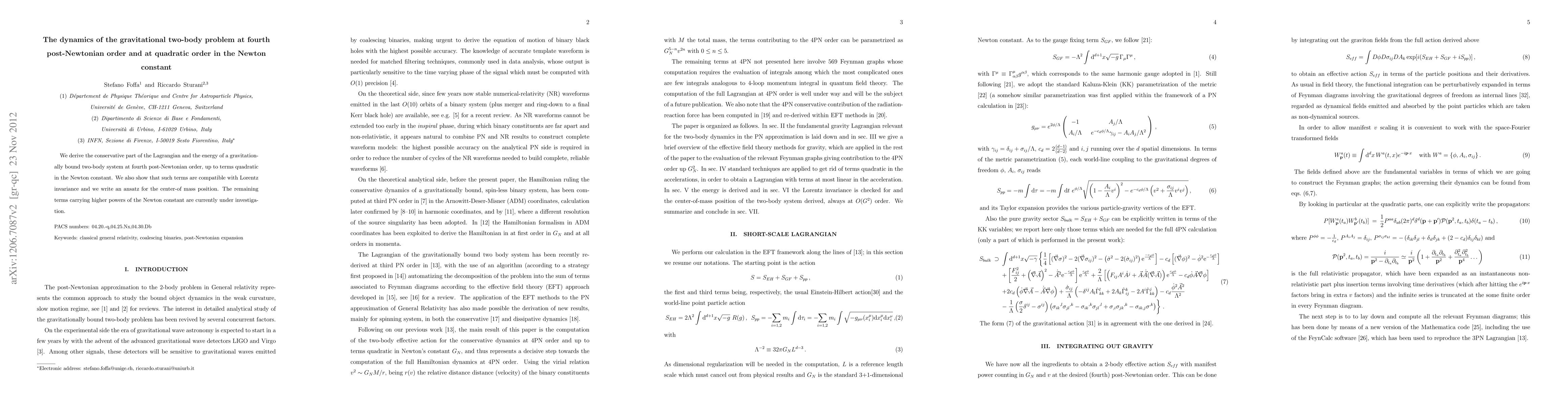 We derive the conservative part of the Lagrangian and the energy of a gravitationally bound two-body system at fourth post-Newtonian order, up to terms quadratic in the Newton constant. We also show that such terms are compatible with Lorentz invariance and we write an ansatz for the center-of-mass position. The remaining terms carrying higher powers of the Newton constant are currently under investigation.