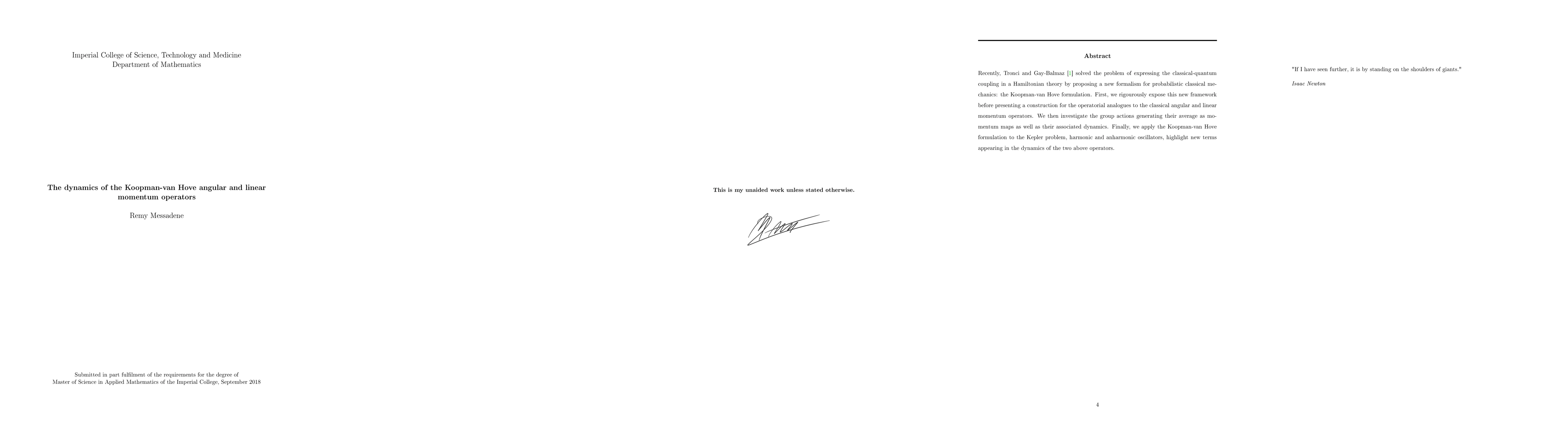A recent formalism capturing the classical-quantum coupling in a Hamiltonian theory for probabilistic classical mechanics has been proposed: the Koopman-van Hove formulation. The aims of this report are twofolds. First, we rigourously expose this new framework for a non-expert audience and present a construction for the operatorial analogues to the classical angular and linear momentum operators. We then investigate the group actions generating their average as momentum maps as well as their associated dynamics. Finally, we illustrate the theory by deriving the Koopman-van Hove formulation to the Kepler problem, harmonic and anharmonic oscillators.