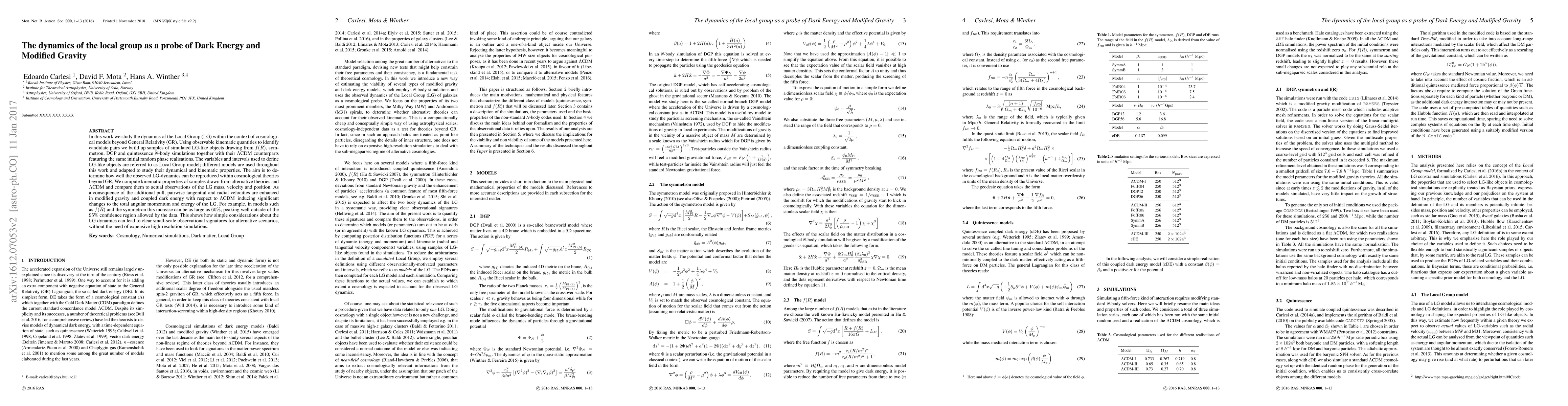 The Local Group's dynamics in alternative gravity theories reveal significant changes in velocity and angular momentum compared to LambdaCDM models, providing small-scale observational signatures for modified gravity scenarios.