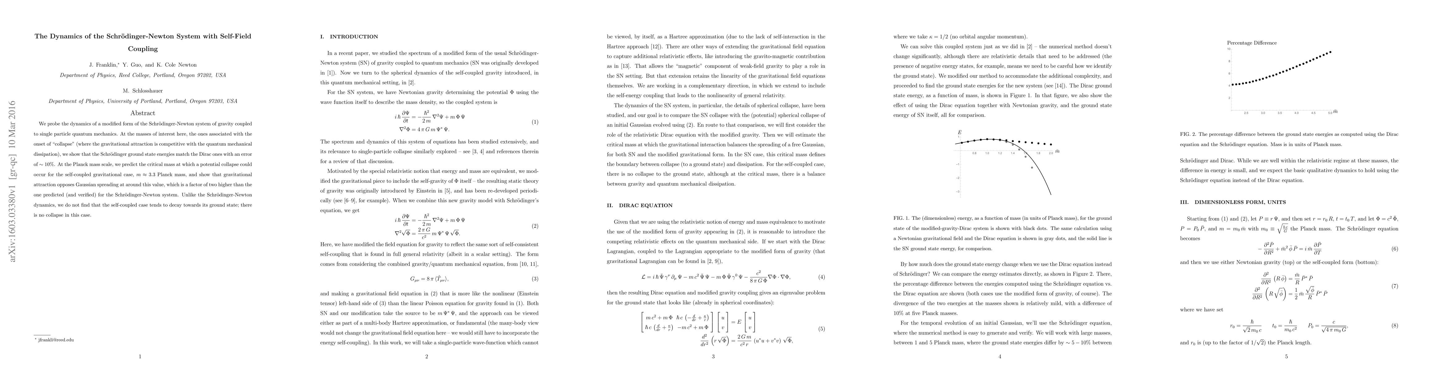 We probe the dynamics of a modified form of the Schrodinger-Newton system of gravity coupled to single particle quantum mechanics. At the masses of interest here, the ones associated with the onset of "collapse" (where the gravitational attraction is competitive with the quantum mechanical dissipation), we show that the Schrodinger ground state energies match the Dirac ones with an error of ~ 10%. At the Planck mass scale, we predict the critical mass at which a potential collapse could occur for the self-coupled gravitational case, m ~ 3.3 Planck mass, and show that gravitational attraction opposes Gaussian spreading at around this value, which is a factor of two higher than the one predicted (and verified) for the Schrodinger-Newton system. Unlike the Schrodinger-Newton dynamics, we do not find that the self-coupled case tends to decay towards its ground state; there is no collapse in this case.