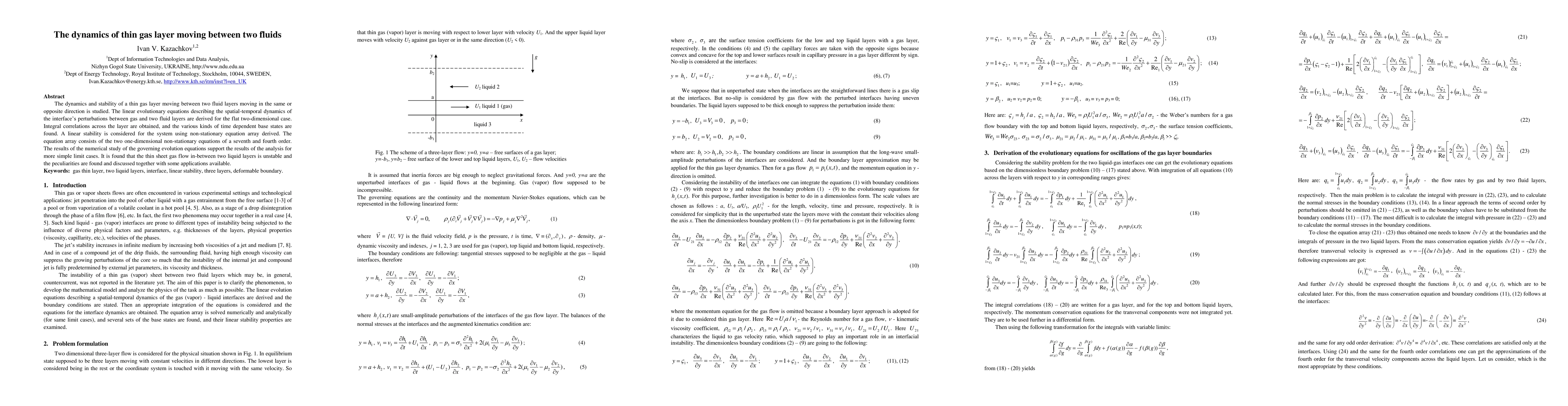 The dynamics and stability of a thin gas layer moving between two fluid layers moving in the same or opposite direction is studied. The linear evolutionary equations describing the spatial-temporal dynamics of the interface perturbations between gas and two fluid layers are derived for the flat two-dimensional case. Integral correlations across the layer are obtained, and the various kinds of time dependent base states are found. A linear stability is considered for the system using non-stationary equation array derived. The equation array consists of the two one-dimensional non-stationary equations of a seventh and fourth order. The results of the numerical study of the governing evolution equations support the results of the analysis for more simple limit cases. It is found that the thin sheet gas flow in-between two liquid layers is unstable and the peculiarities are found and discussed together with some applications available.