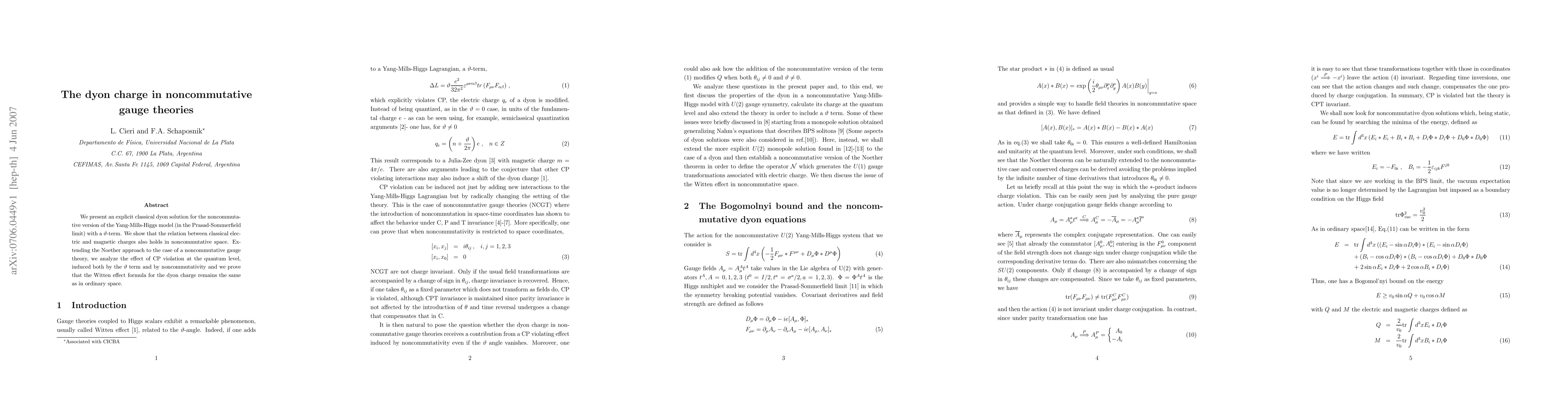 This paper presents a classical dyon solution in noncommutative Yang-Mills-Higgs theory, demonstrating that the relationship between electric and magnetic charges persists. It also explores CP violation in quantum noncommutative gauge theories, confirming the Witten effect formula for dyon charge remains unchanged.