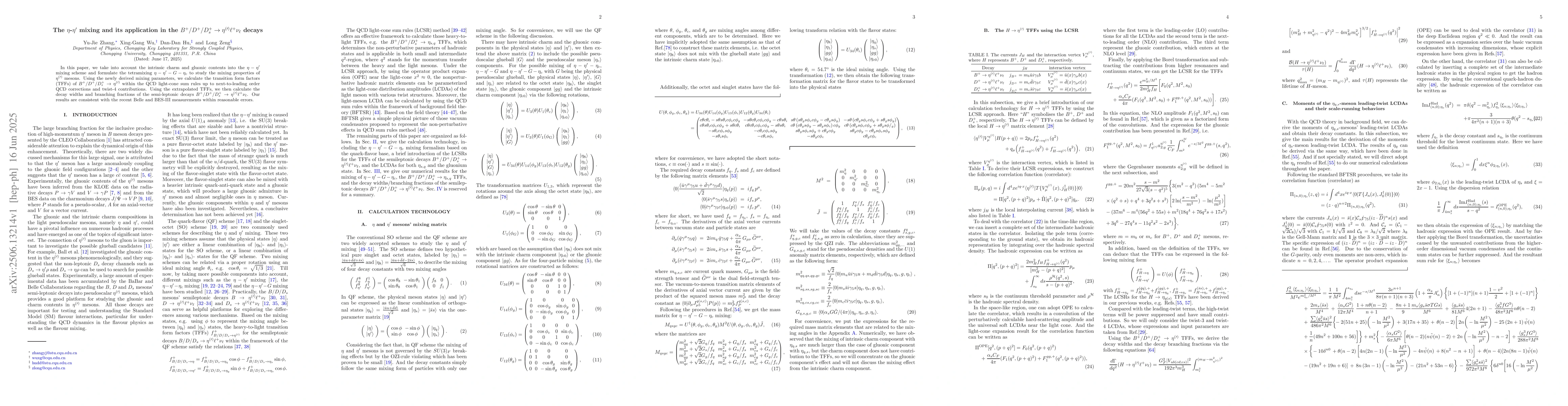 In this paper, we take into account the intrinsic charm and gluonic contents into the $\eta-\eta^\prime$ mixing scheme and formulate the tetramixing $\eta-\eta^\prime-G-\eta_c$ to study the mixing properties of $\eta^{(\prime)}$ mesons. Using the newly derived mixing parameters, we calculate the transition form factors (TFFs) of $B^+/D^+/D_s^+\to\eta^{(\prime)}$ within the QCD light-cone sum rules up to next-to-leading order QCD corrections and twist-4 contributions. Using the extrapolated TFFs, we then calculate the decay widths and branching fractions of the semi-leptonic decays $B^+/D^+/D_s^+\to\eta^{(\prime)}\ell^+\nu_{\ell}$. Our results are consistent with the recent Belle and BES-III measurements within reasonable errors.