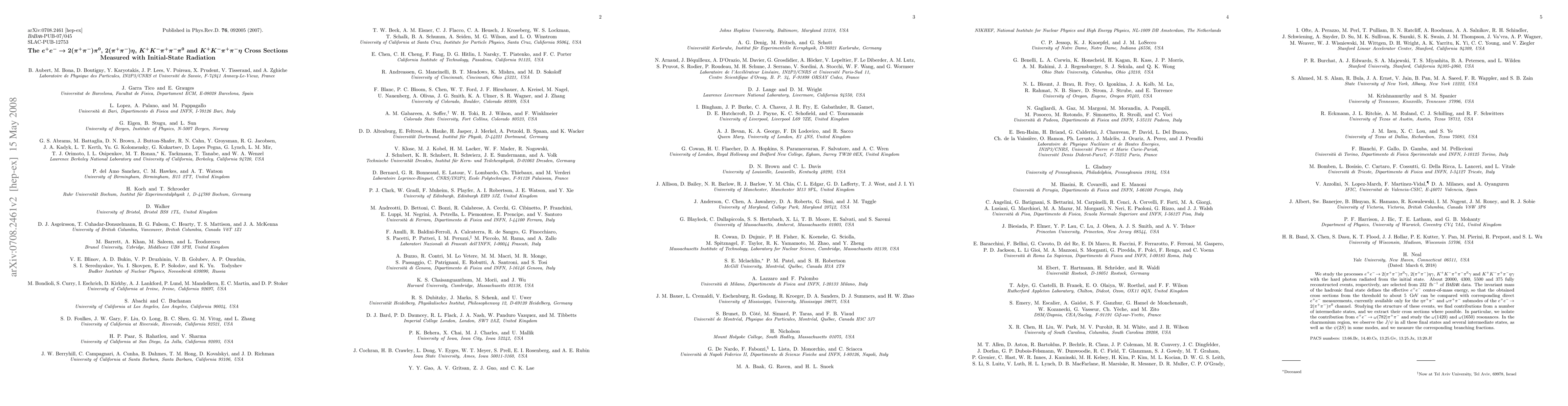 This paper measures cross sections for various $e^+ e^-$ annihilation processes with an initial-state radiated photon, analyzing data from 232 fb$^{-1}$ at BaBar. It identifies significant contributions from intermediate states, including $\omega$ resonances, and reports branching fractions for $J/\psi$ and $\psi(2S)$ in the charmonium region.