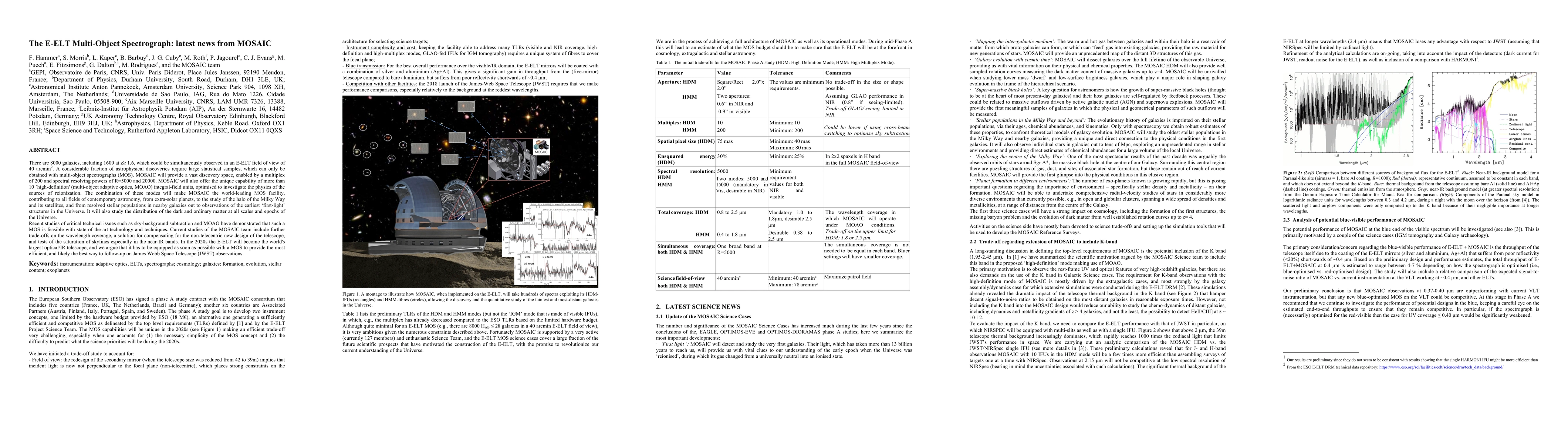 The MOSAIC multi-object spectrograph for the E-ELT will enable the simultaneous observation of 8000 galaxies, including 1600 at redshifts greater than 1.6, providing vast discovery space and high-definition adaptive optics for studying early Universe structures. The spectrograph's multiplexing capabilities and advanced technical studies position it as a leading tool for contemporary astronomy.