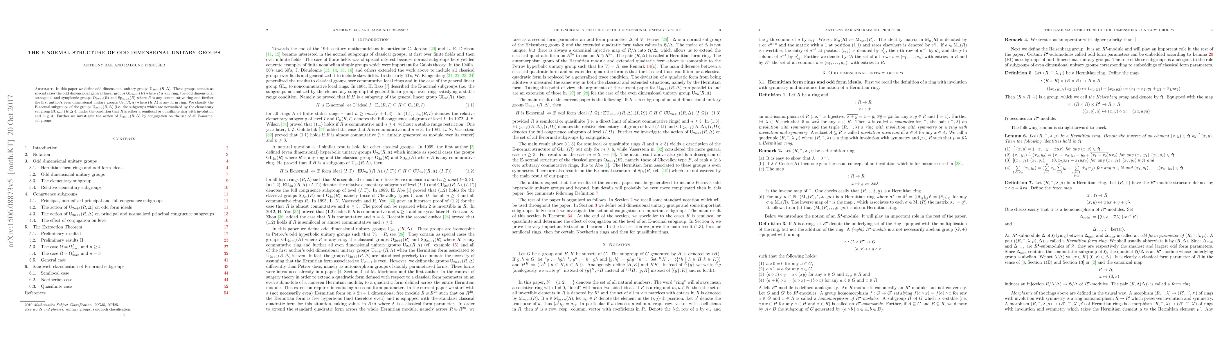 In this paper we define odd dimensional unitary groups $U_{2n+1}(R,\Delta)$. These groups contain as special cases the odd dimensional general linear groups $GL_{2n+1}(R)$ where $R$ is any ring, the odd dimensional orthogonal and symplectic groups $O_{2n+1}(R)$ and $Sp_{2n+1}(R)$ where $R$ is any commutative ring and further the first author's even dimensional unitary groups $U_{2n}(R,\Lambda)$ where $(R,\Lambda)$ is any form ring. We classify the E-normal subgroups of the groups $U_{2n+1}(R,\Delta)$ (i.e. the subgroups which are normalized by the elementary subgroup $EU_{2n+1}(R,\Delta)$), under the condition that $R$ is either a semilocal or quasifinite ring with involution and $n\geq 3$. Further we investigate the action of $U_{2n+1}(R,\Delta)$ by conjugation on the set of all E-normal subgroups.
