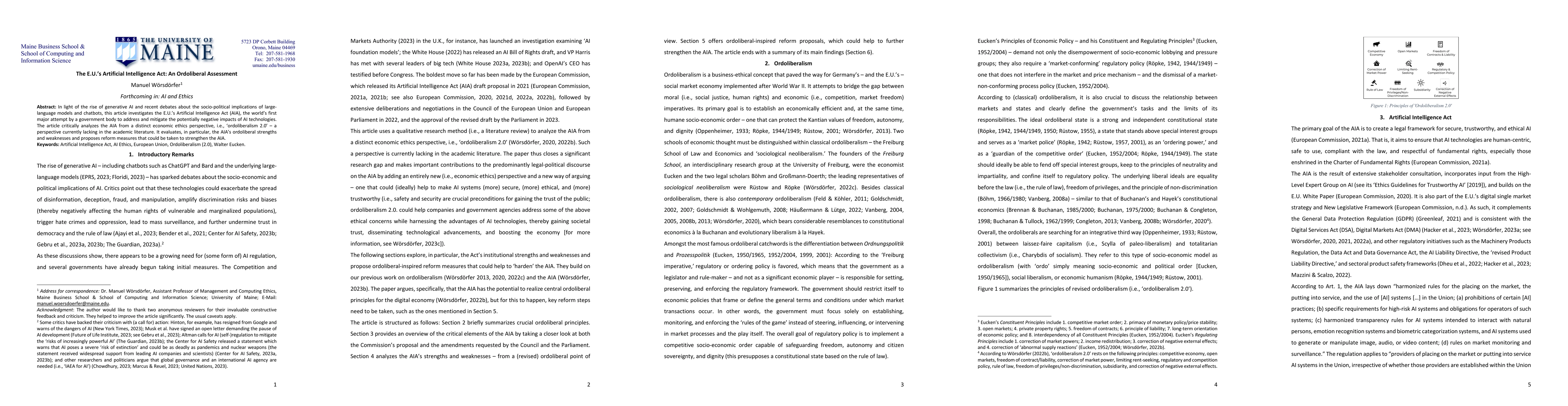 In light of the rise of generative AI and recent debates about the socio-political implications of large-language models and chatbots, this article investigates the E.U.'s Artificial Intelligence Act (AIA), the world's first major attempt by a government body to address and mitigate the potentially negative impacts of AI technologies. The article critically analyzes the AIA from a distinct economic ethics perspective, i.e., ordoliberalism 2.0 - a perspective currently lacking in the academic literature. It evaluates, in particular, the AIA's ordoliberal strengths and weaknesses and proposes reform measures that could be taken to strengthen the AIA.