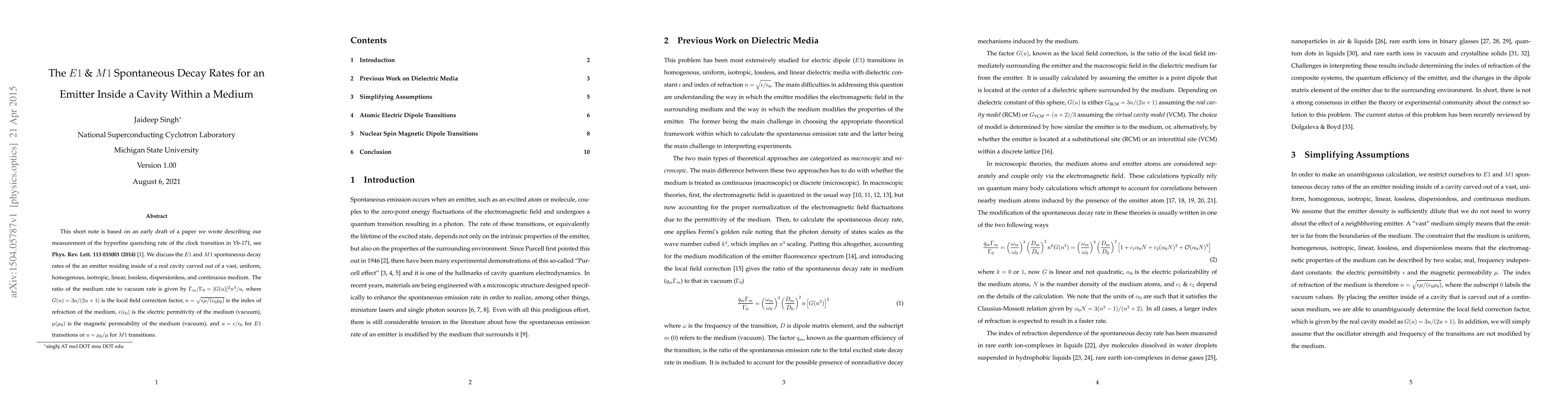 We discuss the $E1$ and $M1$ spontaneous decay rates of the an emitter residing inside of a real cavity carved out of a vast, uniform, homogenous, isotropic, linear, lossless, dispersionless, and continuous medium. The ratio of the medium rate to vacuum rate is given by $\Gamma_m/\Gamma_0 = [G(u)]^2 n^3 / u$, where $G(u) = 3u/(2u+1)$ is the local field correction factor, $n = \sqrt{\epsilon\mu/(\epsilon_0\mu_0)}$ is the index of refraction of the medium, $\epsilon(\epsilon_0)$ is the electric permitivity of the medium (vacuum), $\mu(\mu_0)$ is the magnetic permeability of the medium (vacuum), and $u = \epsilon/\epsilon_0$ for $E1$ transitions or $u = \mu_0/\mu$ for $M1$ transitions.