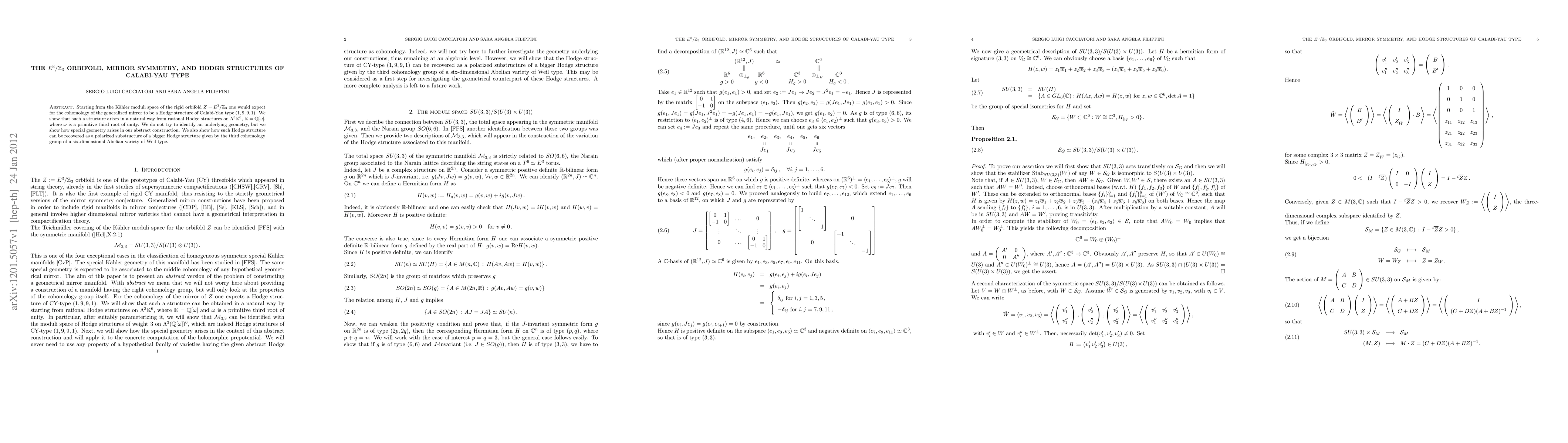 Starting from the K\"ahler moduli space of the rigid orbifold Z=E^3/\mathbb{Z}_3 one would expect for the cohomology of the generalized mirror to be a Hodge structure of Calabi-Yau type (1,9,9,1). We show that such a structure arises in a natural way from rational Hodge structures on \Lambda^3 \mathbb{K}^6, \mathbb{K}=\mathbb{Q}[\omega], where \omega is a primitive third root of unity. We do not try to identify an underlying geometry, but we show how special geometry arises in our abstract construction. We also show how such Hodge structure can be recovered as a polarized substructure of a bigger Hodge structure given by the third cohomology group of a six-dimensional Abelian variety of Weil type.