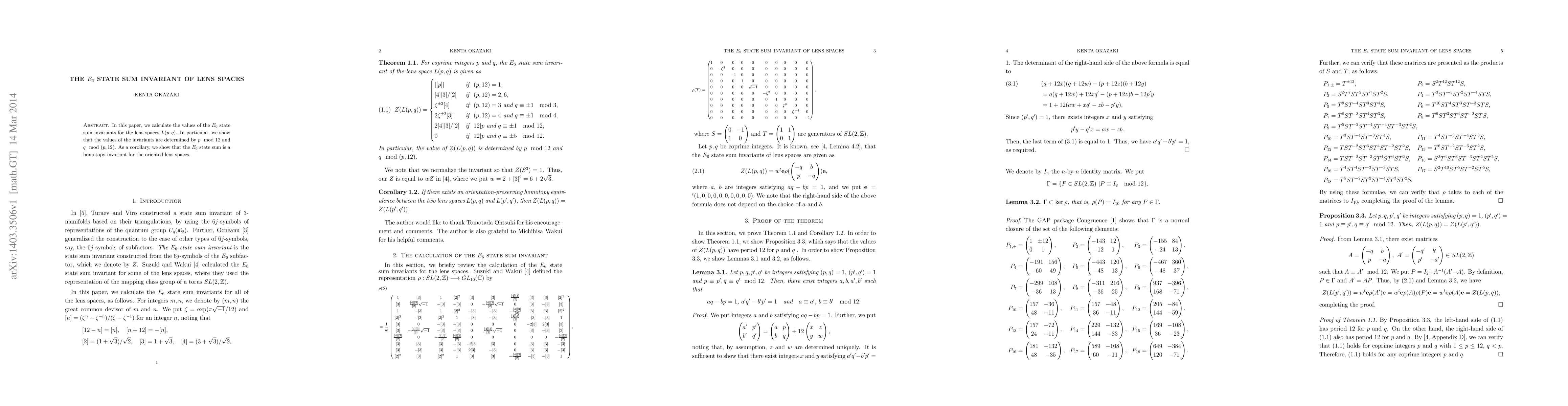 This paper calculates the $E_6$ state sum invariants for lens spaces $L(p,q)$, finding their values depend on $p mod 12$ and $q mod (p,12)$. It concludes that the $E_6$ state sum is a homotopy invariant for oriented lens spaces.