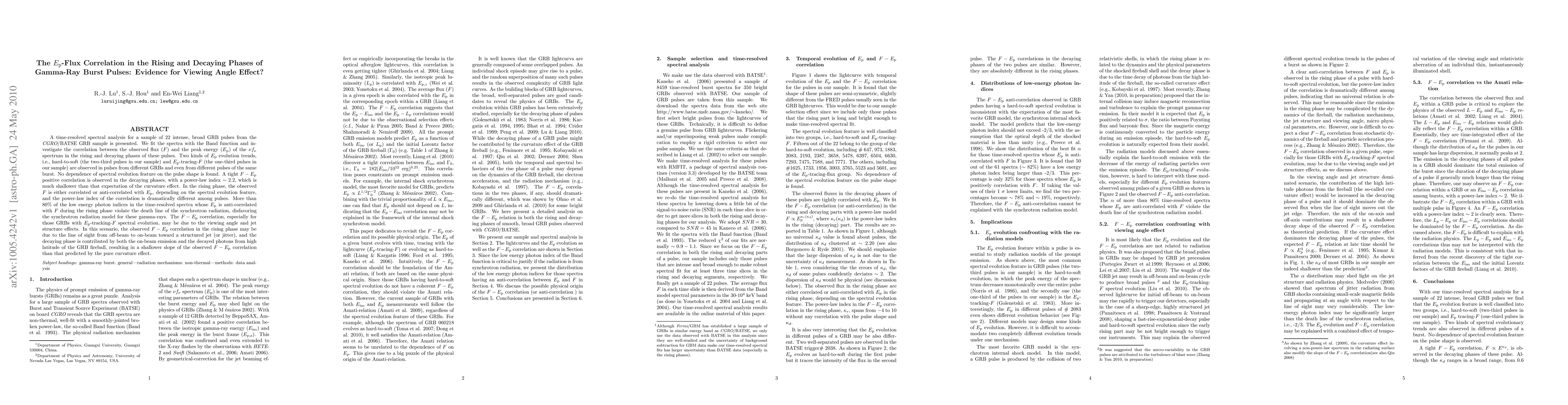 A time-resolved spectral analysis for a sample of 22 intense, broad GRB pulses from the BATSE GRB sample is presented. We fit the spectra with the Band function and investigate the correlation between the observed flux (F) and the peak energy (E_p) of the $\nu f_\nu$ spectrum in the rising and decaying phases of these pulses. Two kinds of E_p evolution trends, i.e., hard-to-soft (the two-third pulses in our sample) and $E_{\rm p}$-tracing-$F$ (the one-third pulses in our sample) are observed in pulses from different GRBs and even from different pulses of the same burst. No dependence of spectral evolution feature on the pulse shape is found. A tight $F-E_{\rm p}$ positive correlation is observed in the decaying phases, with a power-law index $\sim 2.2$, which is much shallower than that expectation of the curvature effect. In the rising phase, the observed $F$ is either correlated or anti-correlated with $E_{\rm p}$, depending on the spectral evolution feature, and the power-law index of the correlation is dramatically different among pulses. More than $80%$ of the low energy photon indices in the time-resolved spectra whose $E_{\rm p}$ is anti-correlated with $F$ during the rising phase violate the death line of the synchrotron radiation, disfavoring the synchrotron radiation model for these gamma-rays. The $F-E_{\rm p}$ correlation, especially for those GRBs with $E_{\rm p}$-tracking-$F$ spectral evolution, may be due to the viewing angle and jet structure effects. In this cenario, the observed $F-E_{\rm p}$ correlation in the rising phase may be due to the line of sight from off-beam to on-beam toward a structured jet (or jitter), and the decaying phase is contributed by both the on-beam emission and the decayed photons from high latitude of the GRB fireball,resulting in a shallower slope of the observed $F-E_{\rm p}$ correlation than that predicted by the pure curvature effect.