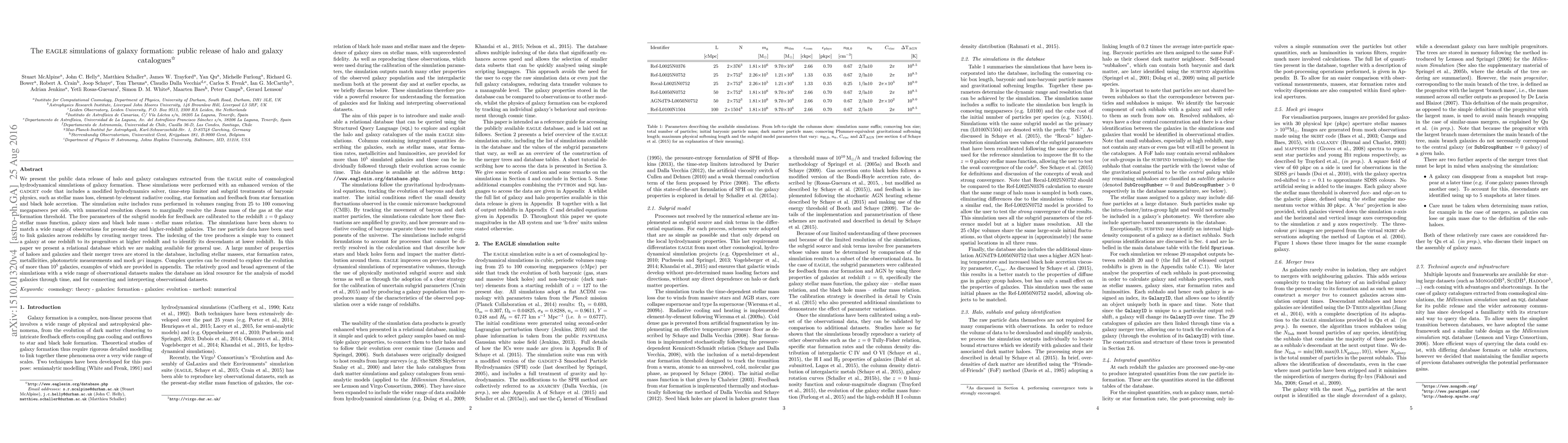 The EAGLE simulations release detailed halo and galaxy catalogues from cosmological hydrodynamical simulations, featuring subgrid models calibrated to match observational data. The public database includes extensive galaxy properties and merger trees, enabling exploration of over 10^5 galaxies' evolution.