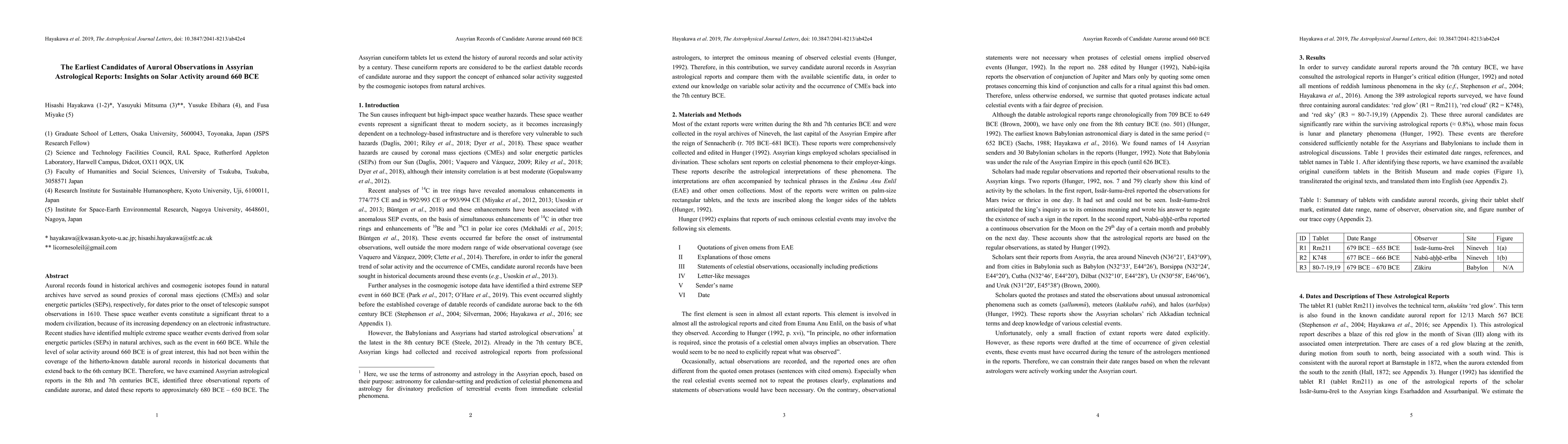 Auroral records found in historical archives and cosmogenic isotopes found in natural archives have served as sound proxies of coronal mass ejections (CMEs) and solar energetic particles (SEPs), respectively, for dates prior to the onset of telescopic sunspot observations in 1610. These space weather events constitute a significant threat to a modern civilization, because of its increasing dependency on an electronic infrastructure. Recent studies have identified multiple extreme space weather events derived from solar energetic particles (SEPs) in natural archives, such as the event in 660 BCE. While the level of solar activity around 660 BCE is of great interest, this had not been within the coverage of the hitherto-known datable auroral records in historical documents that extend back to the 6th century BCE. Therefore, we have examined Assyrian astrological reports in the 8th and 7th centuries BCE, identified three observational reports of candidate aurorae, and dated these reports to approximately 680 BCE -- 650 BCE. The Assyrian cuneiform tablets let us extend the history of auroral records and solar activity by a century. These cuneiform reports are considered to be the earliest datable records of candidate aurorae and they support the concept of enhanced solar activity suggested by the cosmogenic isotopes from natural archives.