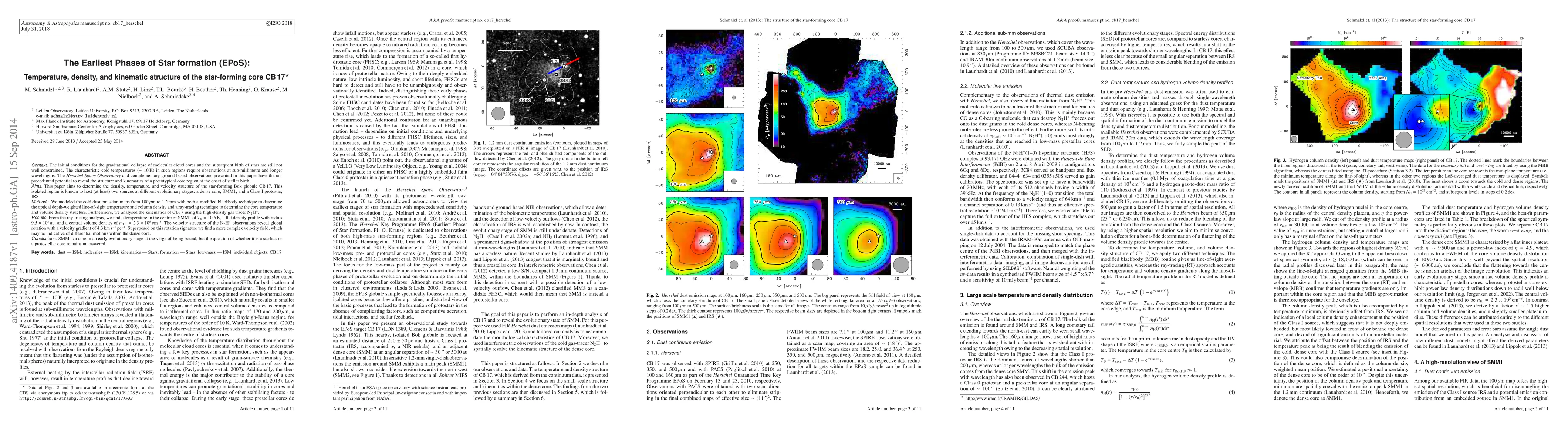 Context: The initial conditions for the gravitational collapse of molecular cloud cores and the subsequent birth of stars are still not well constrained. The characteristic cold temperatures (about 10 K) in such regions require observations at sub-millimetre and longer wavelengths. The Herschel Space Observatory and complementary ground-based observations presented in this paper have the unprecedented potential to reveal the structure and kinematics of a prototypical core region at the onset of stellar birth. Aims: This paper aims to determine the density, temperature, and velocity structure of the star-forming Bok globule CB 17. This isolated region is known to host (at least) two sources at different evolutionary stages: a dense core, SMM1, and a Class I protostar, IRS. Methods: We modeled the cold dust emission maps from 100 micron to 1.2 mm with both a modified blackbody technique to determine the optical depth-weighted line-of-sight temperature and column density and a ray-tracing technique to determine the core temperature and volume density structure. Furthermore, we analysed the kinematics of CB17 using the high-density gas tracer N2H+. Results: From the ray-tracing analysis, we find a temperature in the centre of SMM1 of 10.6 K, a flat density profile with radius 9500 au, and a central volume density of n(H) = 2.3x10^5 cm-3. The velocity structure of the N2H+ observations reveal global rotation with a velocity gradient of 4.3 km/s/pc. Superposed on this rotation signature we find a more complex velocity field, which may be indicative of differential motions within the dense core. Conclusions: SMM is a core in an early evolutionary stage at the verge of being bound, but the question of whether it is a starless or a protostellar core remains unanswered.