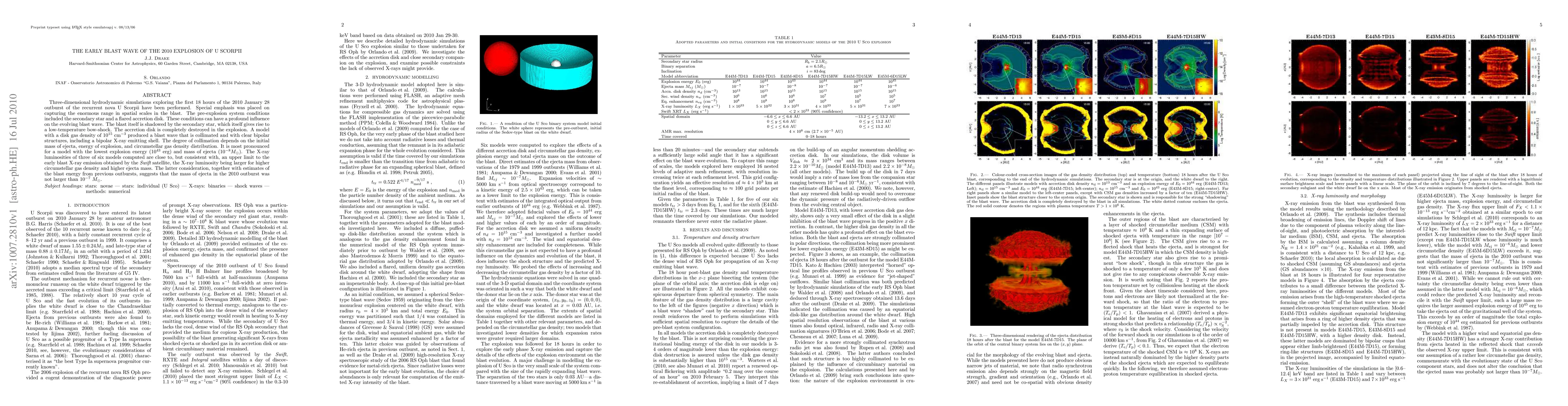 Three-dimensional hydrodynamic simulations exploring the first 18 hours of the 2010 January 28 outburst of the recurrent nova U Scorpii have been performed. Special emphasis was placed on capturing the enormous range in spatial scales in the blast. The pre-explosion system conditions included the secondary star and a flared accretion disk. These conditions can have a profound influence on the evolving blast wave. The blast itself is shadowed by the secondary star, which itself gives rise to a low-temperature bow-shock. The accretion disk is completely destroyed in the explosion. A model with a disk gas density of 10^{15} cm^{-3} produced a blast wave that is collimated and with clear bipolar structures, including a bipolar X-ray emitting shell. The degree of collimation depends on the initial mass of ejecta, energy of explosion, and circumstellar gas density distribution. It is most pronounced for a model with the lowest explosion energy (10^{43} erg) and mass of ejecta (10^{-8} M_{\odot}). The X-ray luminosities of three of six models computed are close to, but consistent with, an upper limit to the early blast X-ray emission obtained by the Swift satellite, the X-ray luminosity being larger for higher circumstellar gas density and higher ejecta mass. The latter consideration, together with estimates of the blast energy from previous outbursts, suggests that the mass of ejecta in the 2010 outburst was not larger than 10^{-7} M_{\odot}.